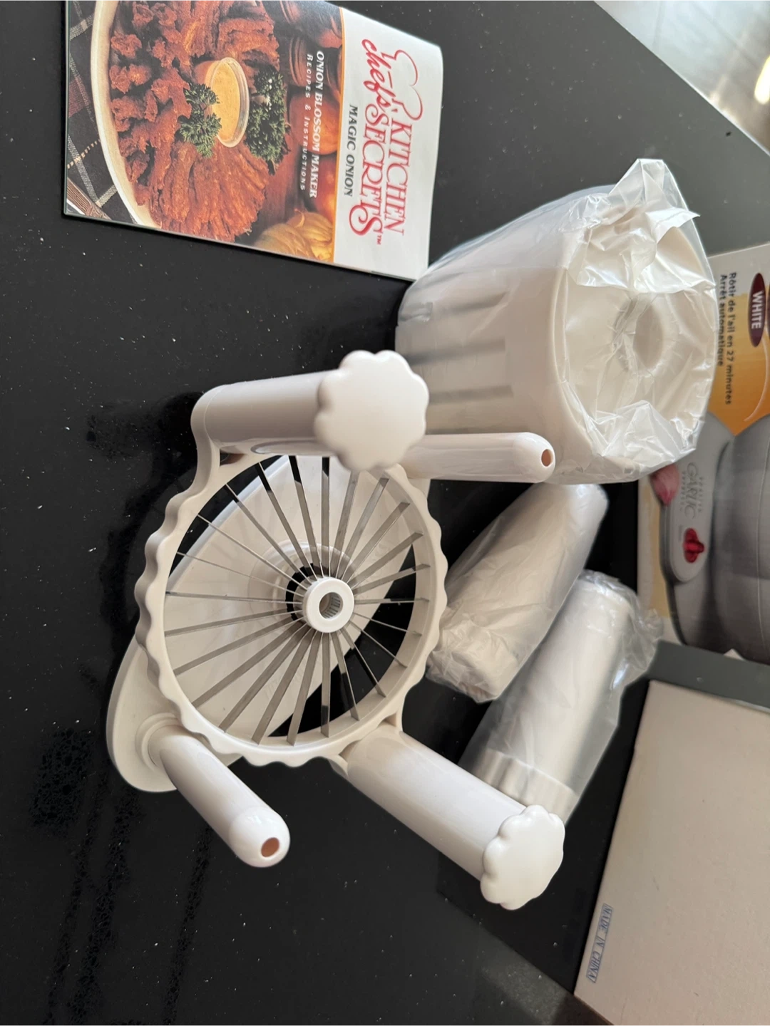 This electric garlic roaster by TODCO roasts garlic in 27 minutes with automatic shut off. It holds up to 3 medium bulbs. Recipes are included! With FREE Onion cutter perfect for parties.