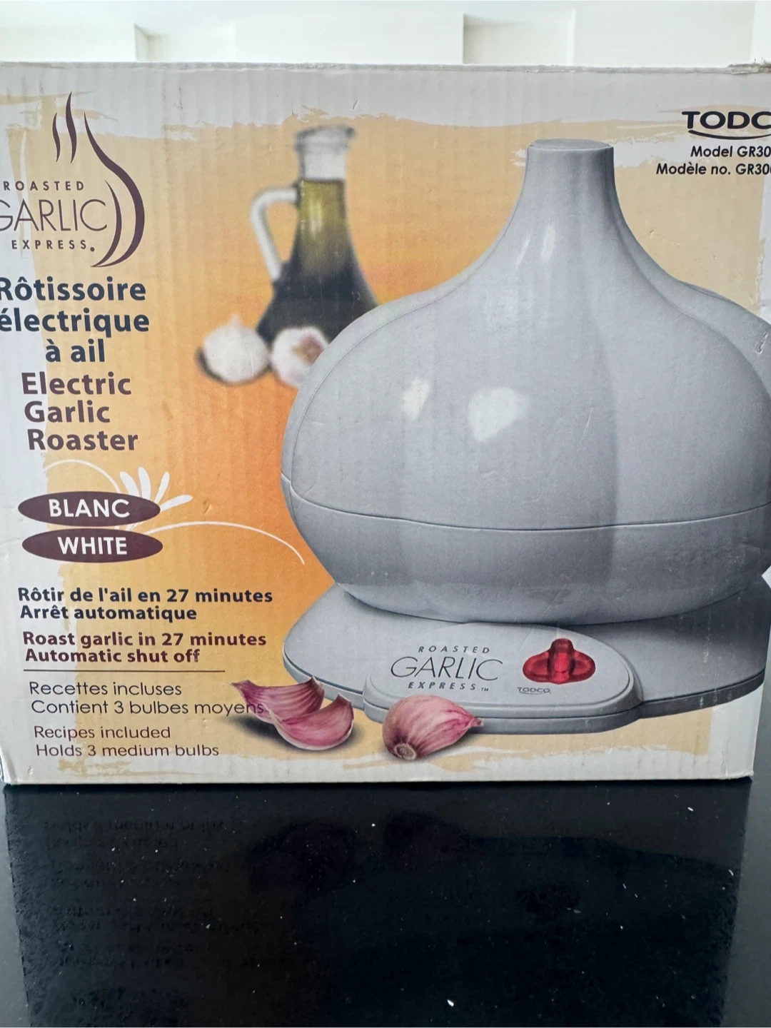 This electric garlic roaster by TODCO roasts garlic in 27 minutes with automatic shut off. It holds up to 3 medium bulbs. Recipes are included! With FREE Onion cutter perfect for parties.