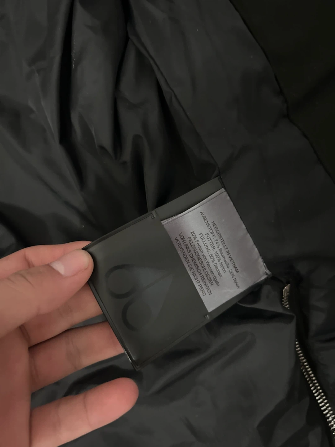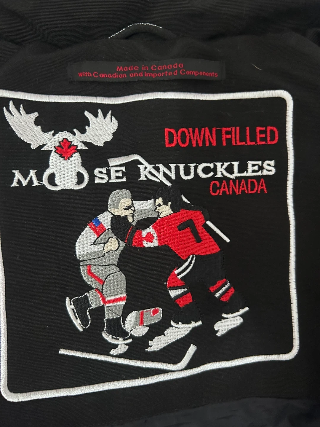 This is a Moose Knuckles down-filled jacket made in Canada. It's black and features a size medium tag inside. Perfect for staying warm during colder months! Comes with moose knuckles bag