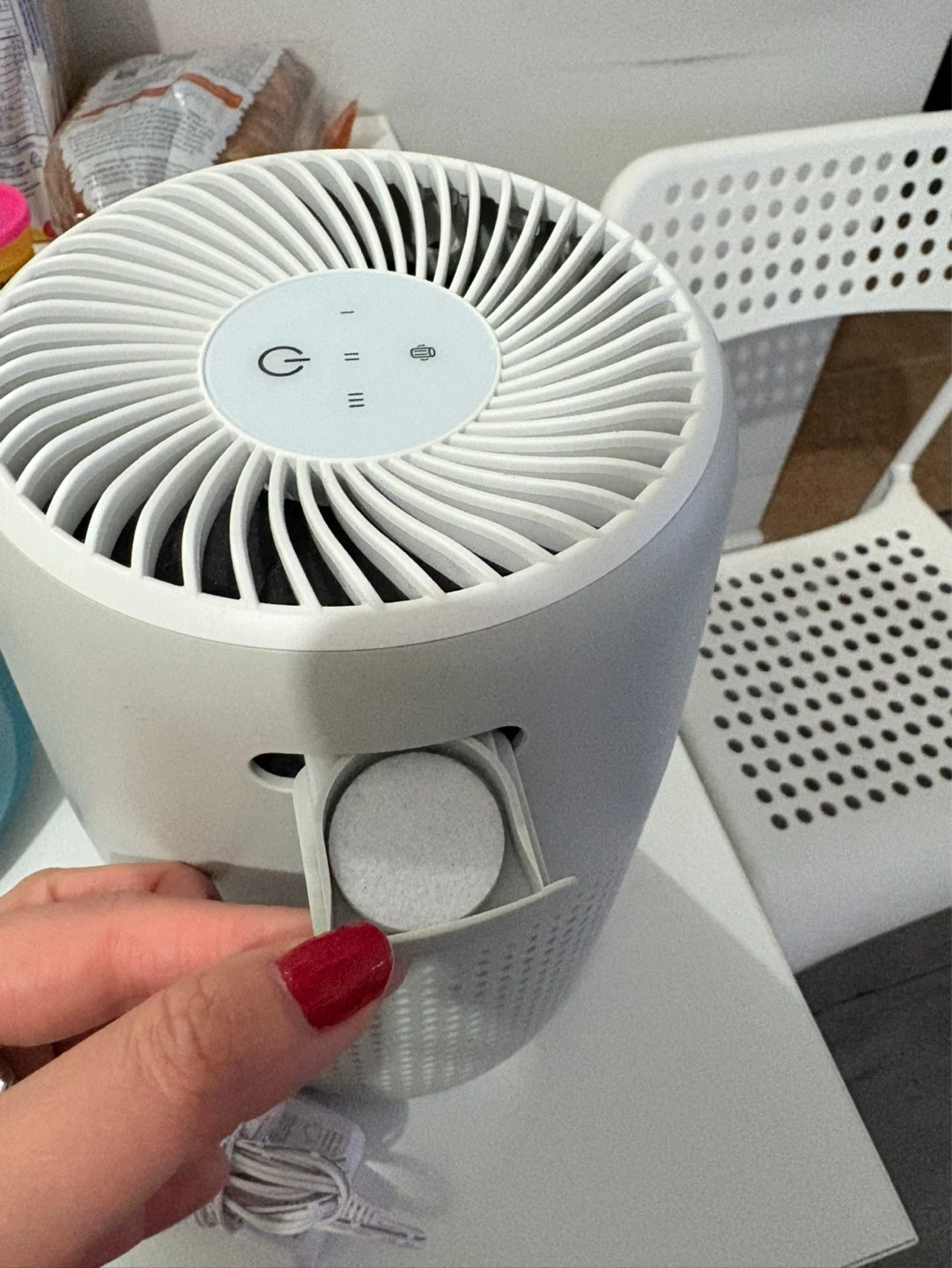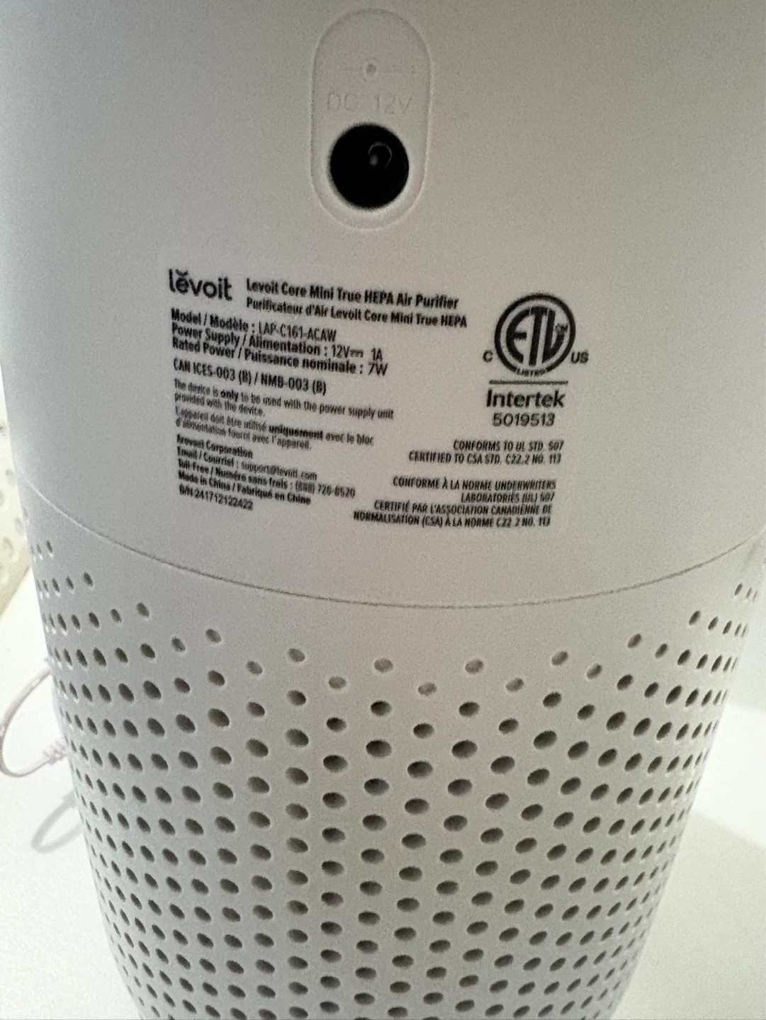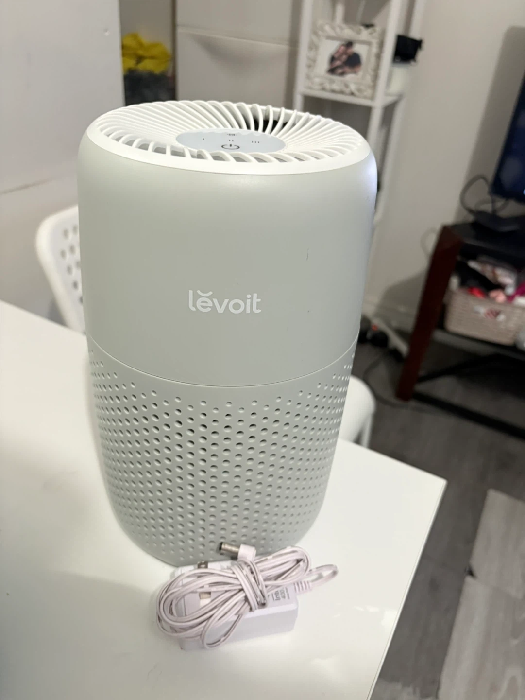 This Levoit air purifier is a compact unit designed for smaller spaces. It features a 3-stage filtration system including a HEPA filter. Includes power adapter. Rated Power: 7W.