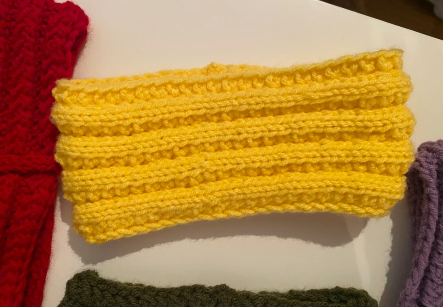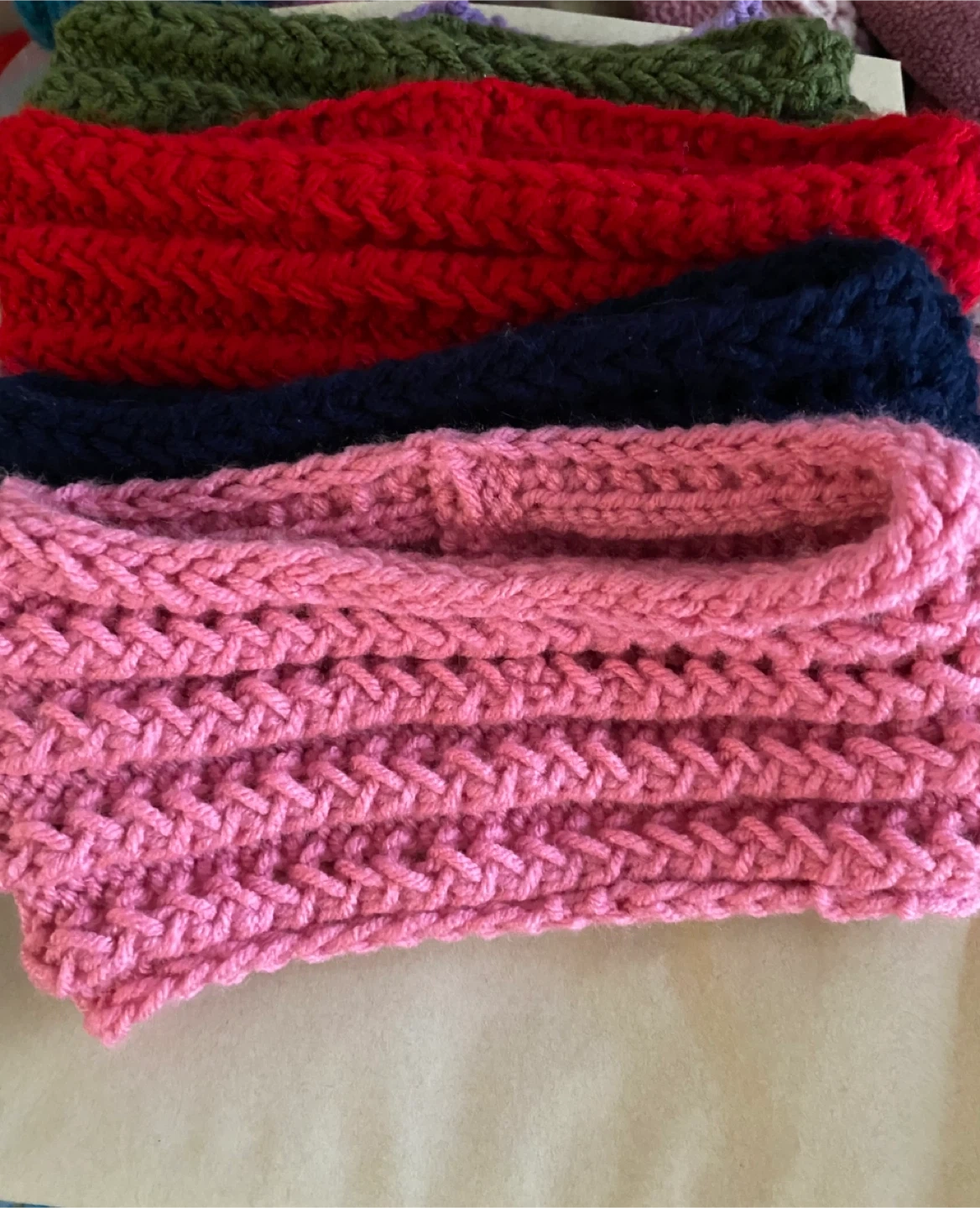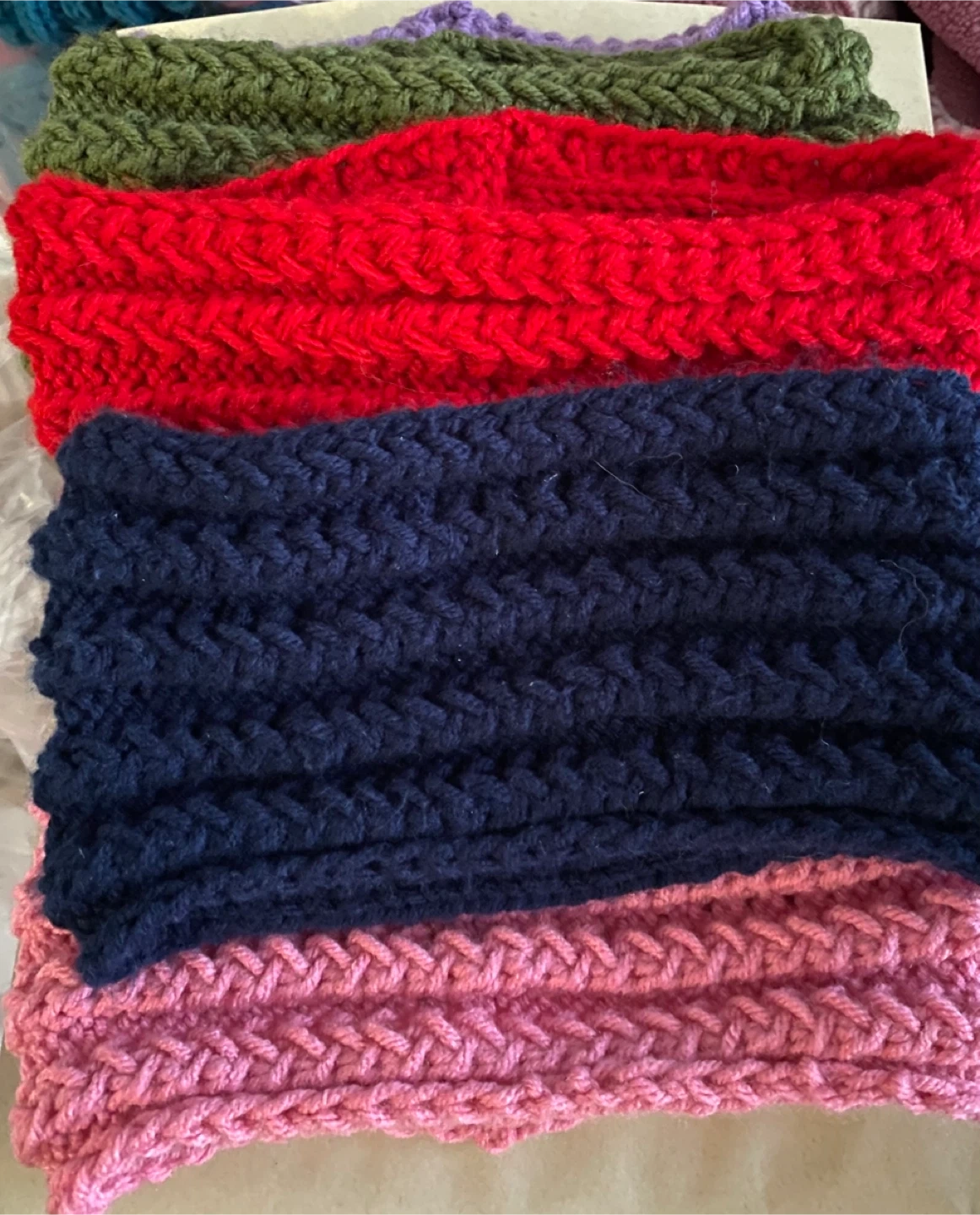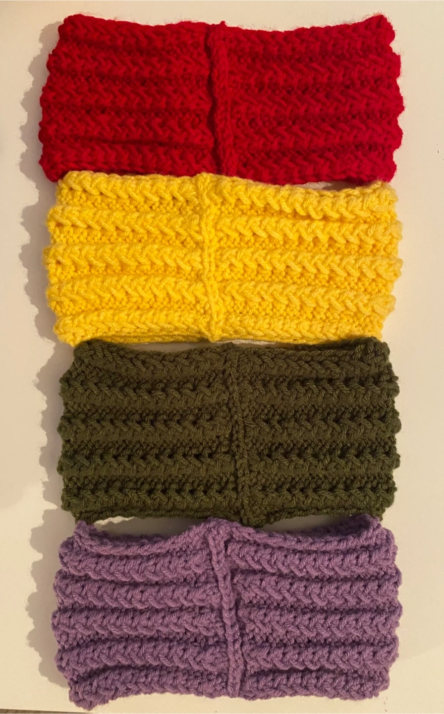 hand-knit headbands. Includes colours in red, navy, olive green, purple, and pink. They're made from a soft acrylic yarn. These are great for keeping hair back and ears warm!