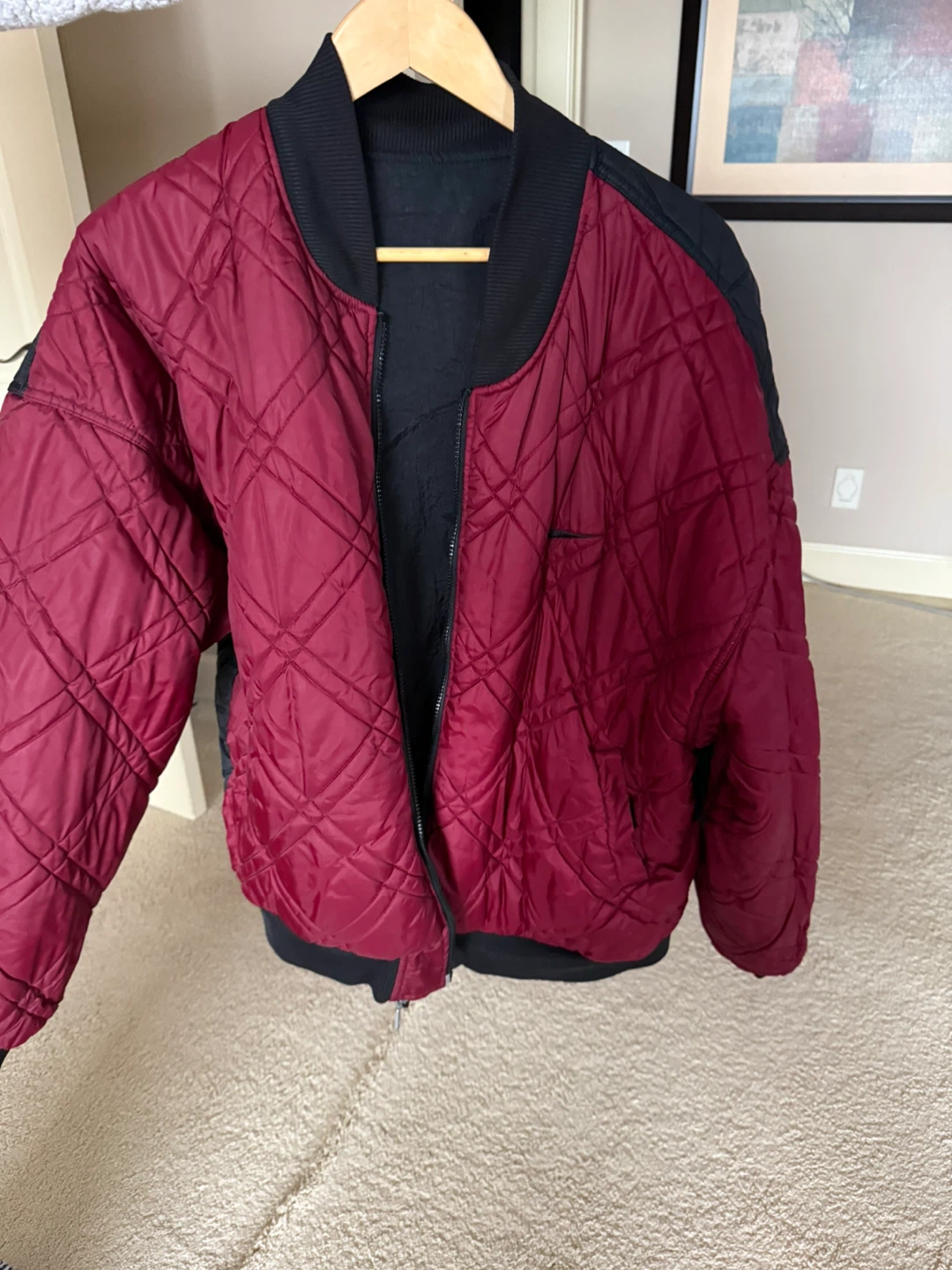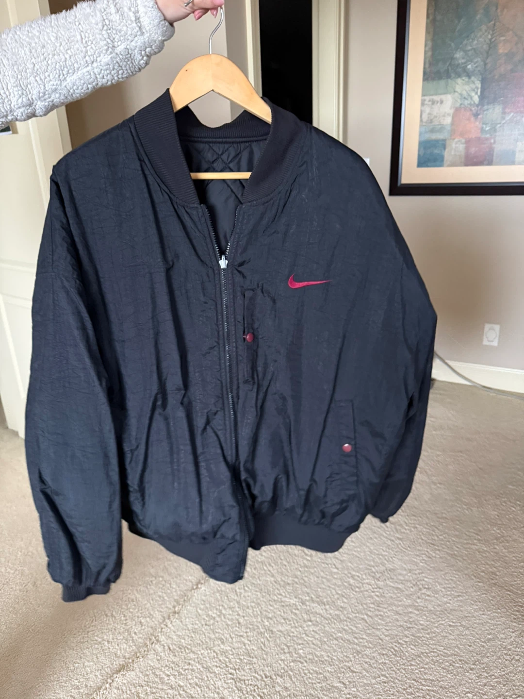 Selling a Nike reversible bomber jacket! One side is black with a red Nike logo, and the other side is a burgundy colour with a black quilted pattern. It's in great condition and ready for a new home! Size XL