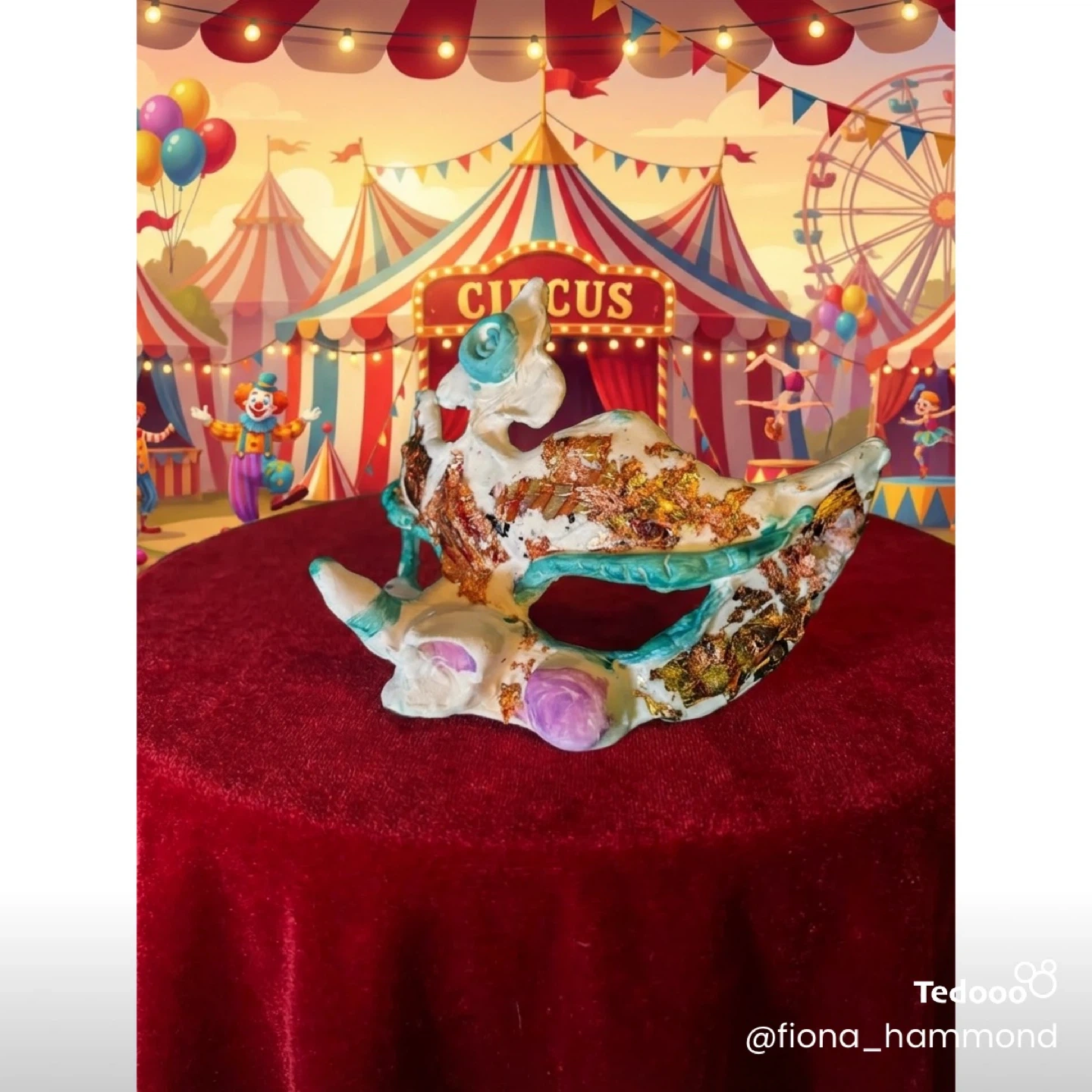 This is a unique, handmade decorative mask. It features a white base with gold leaf accents and teal and purple detailing. It's designed to be a statement piece for costumes or display. One of a kind!