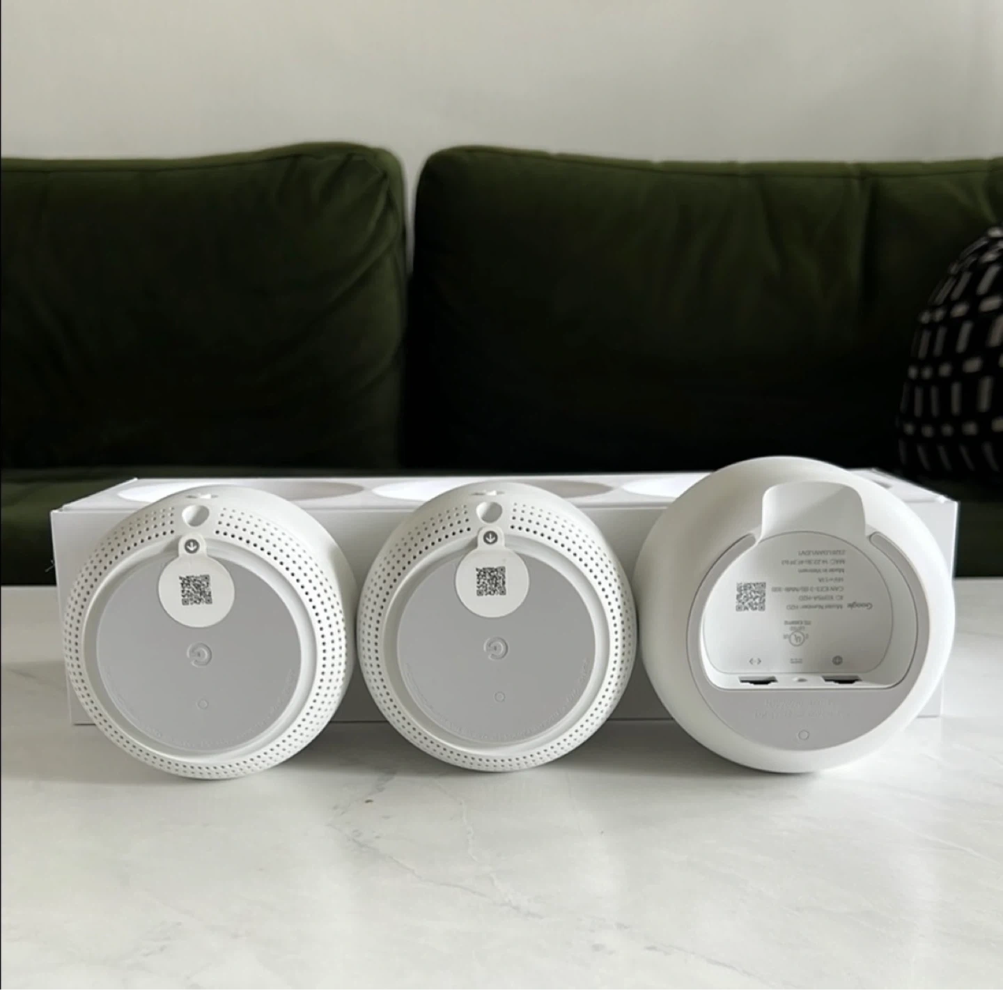 Google Nest Wifi system, consisting of one Wi-Fi router and two Wi-Fi points. Minimalist white design.