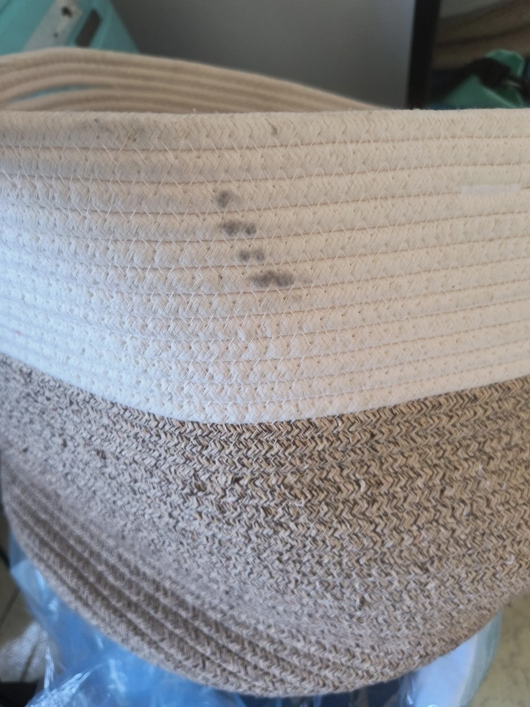This woven rope storage basket is great for organizing your home or just be a laundry baketm It's made of a durable cotton and jute blend. It's in good shape just a scruff on the side that could be washed. If I had a laundry machine in my house id put it through the washer