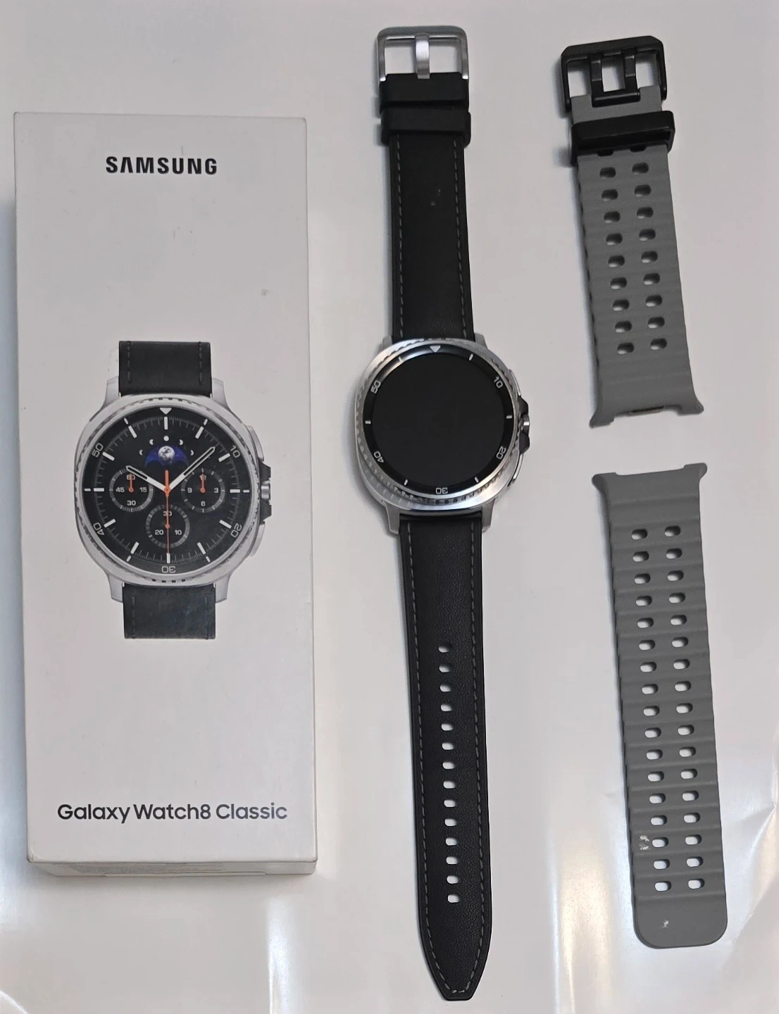 Selling a Samsung Galaxy Watch 8 Classic. It's a smartwatch with a classic design. Comes with the original box, charger, and an extra watch bands for customization.