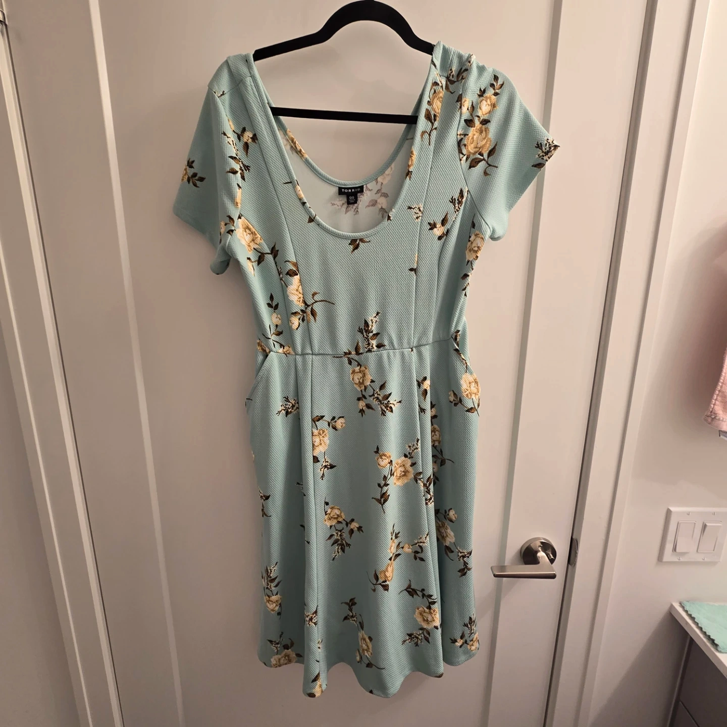 This is a Torrid dress in a light blue colour with a floral pattern. It's a size 00. The dress has short sleeves and pockets.