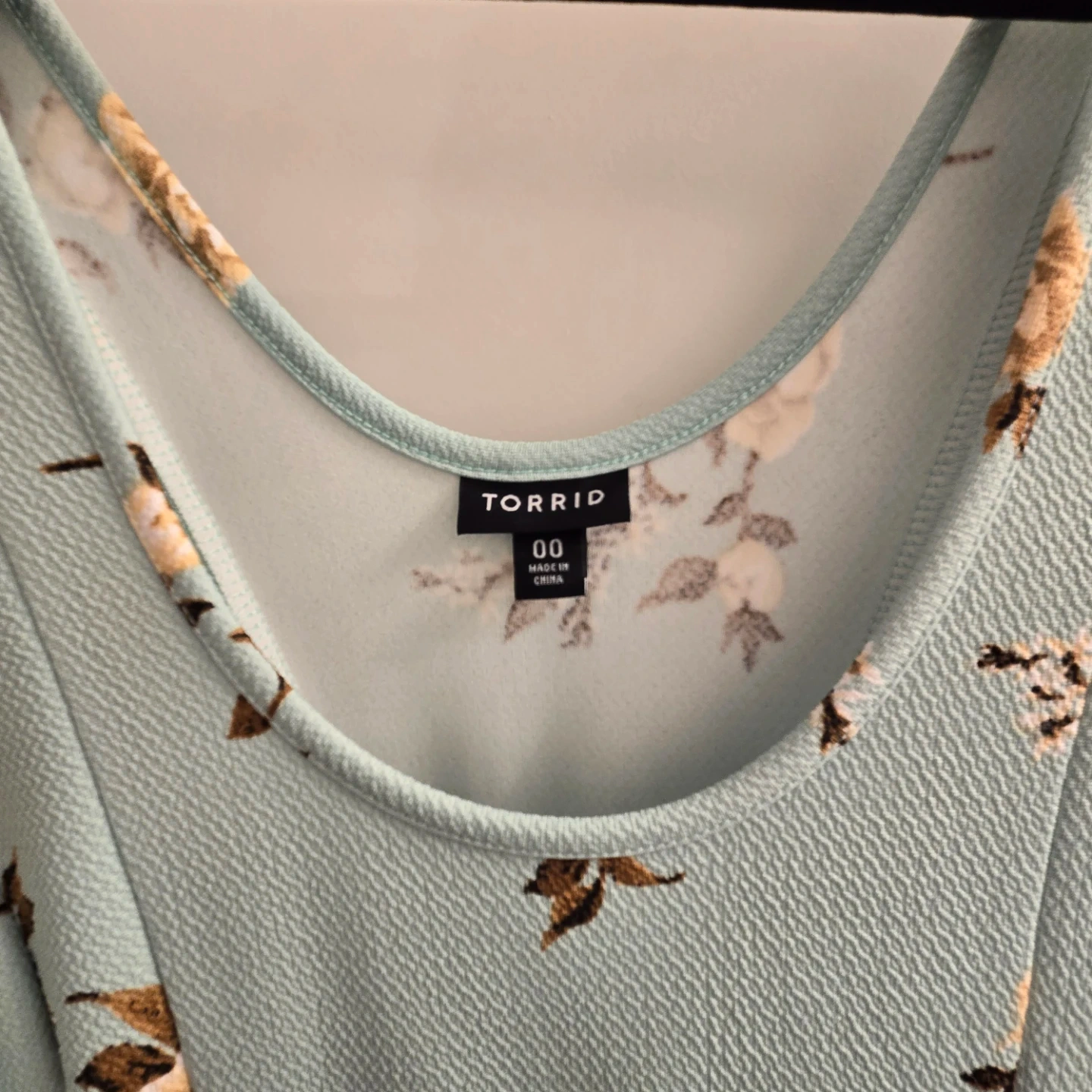 This is a Torrid dress in a light blue colour with a floral pattern. It's a size 00. The dress has short sleeves and pockets.