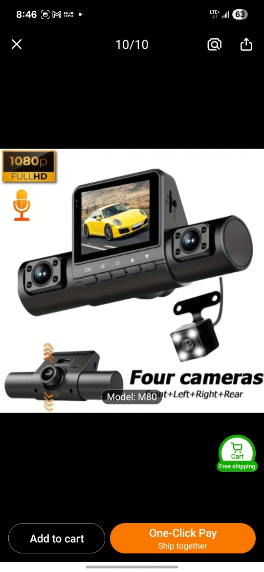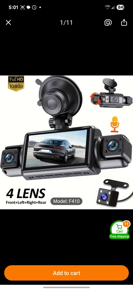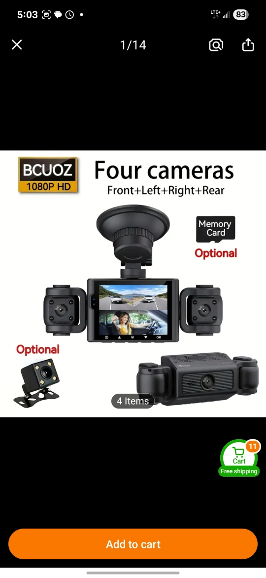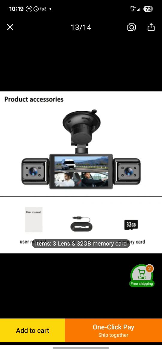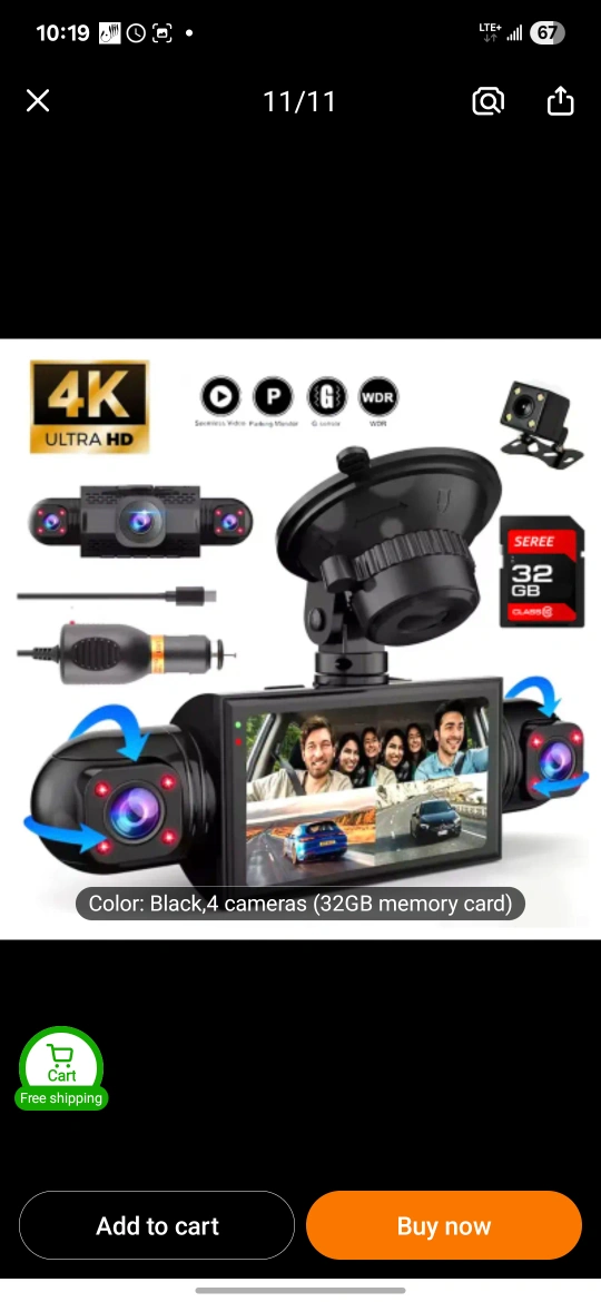 This is a four camera dash cam that records in 1080P Full HD. It has front, left, right, and rear cameras. The product accessories include 3 lenses and a 32GB memory card.