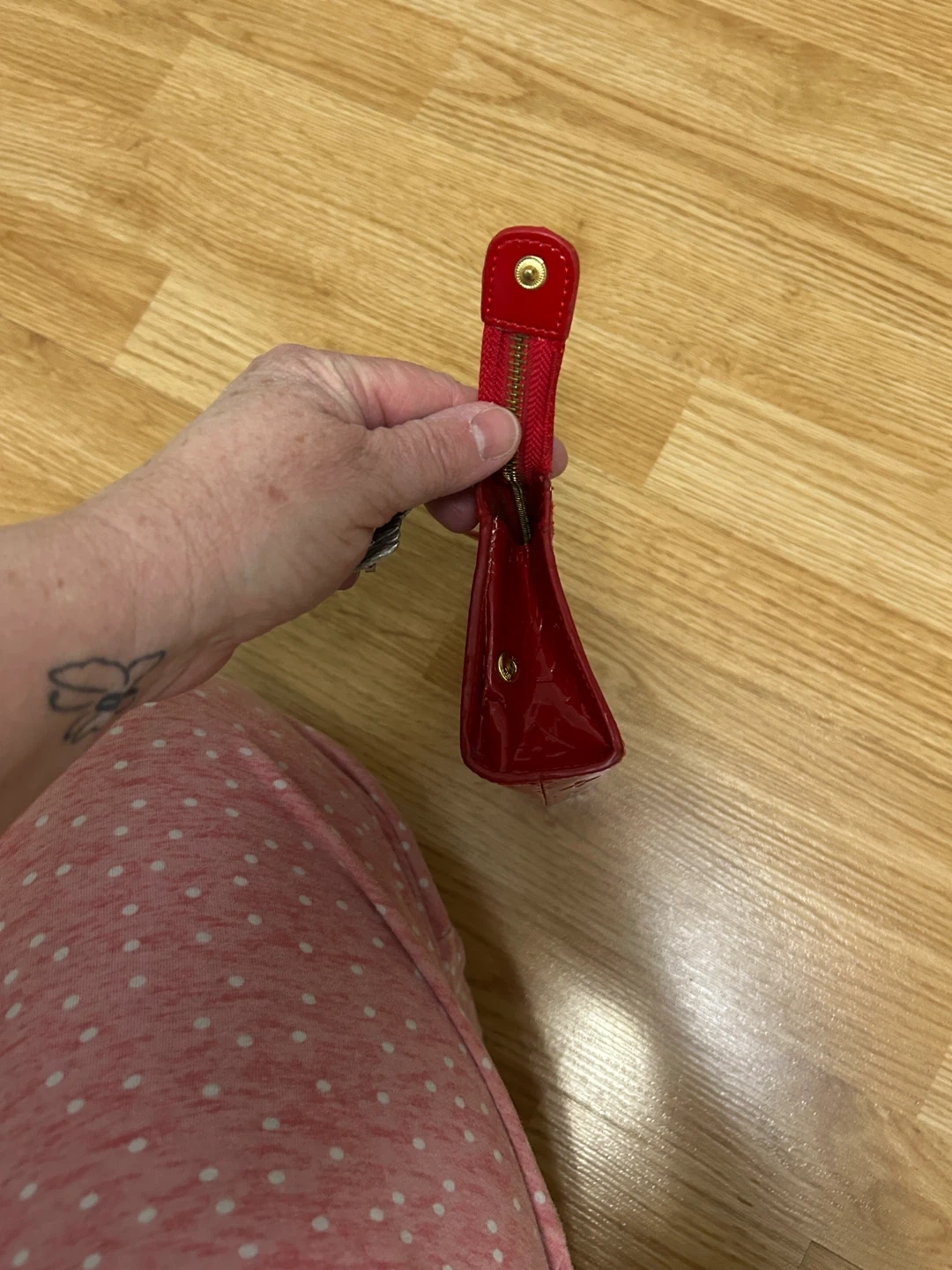 This is a pre-owned red Louis Vuitton Monogram Vernis pouch. It's made of patent leather with the signature LV monogram embossed throughout. The interior features a small pocket and is lined with red leather. Perfect for keeping small essentials organized! Wear shown in pictures.