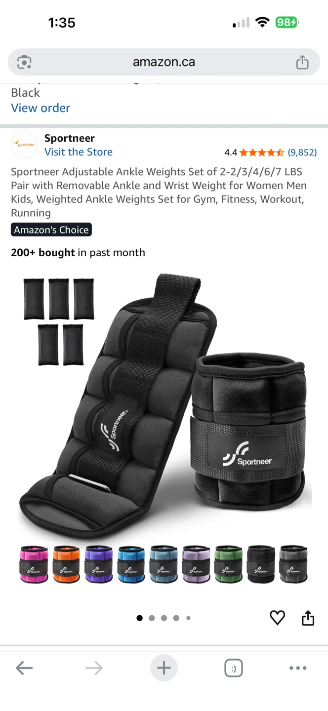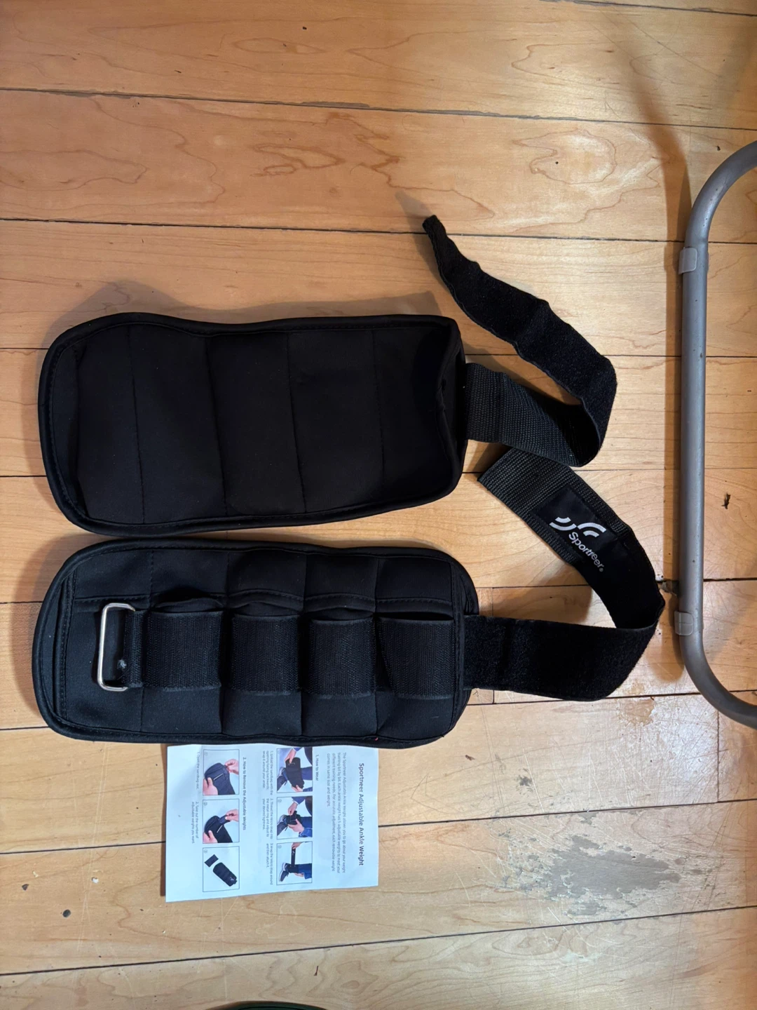 This set includes adjustable ankle weights with removable weights. They're designed for gym, fitness, workout, and running. Black material with velcro straps. 10 weights
