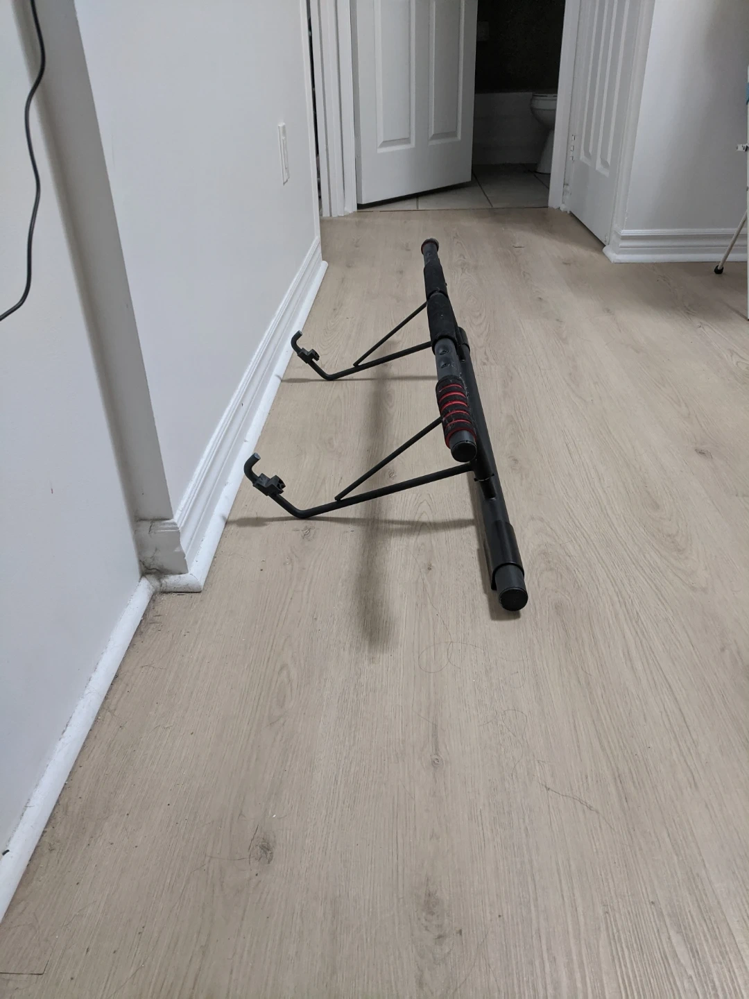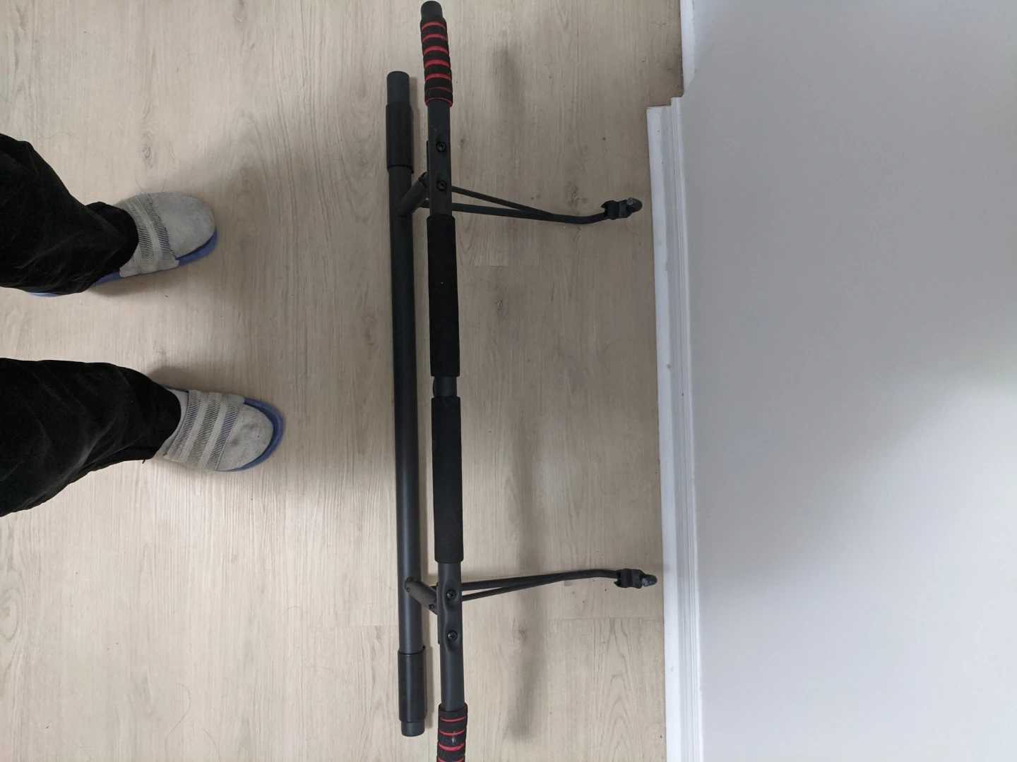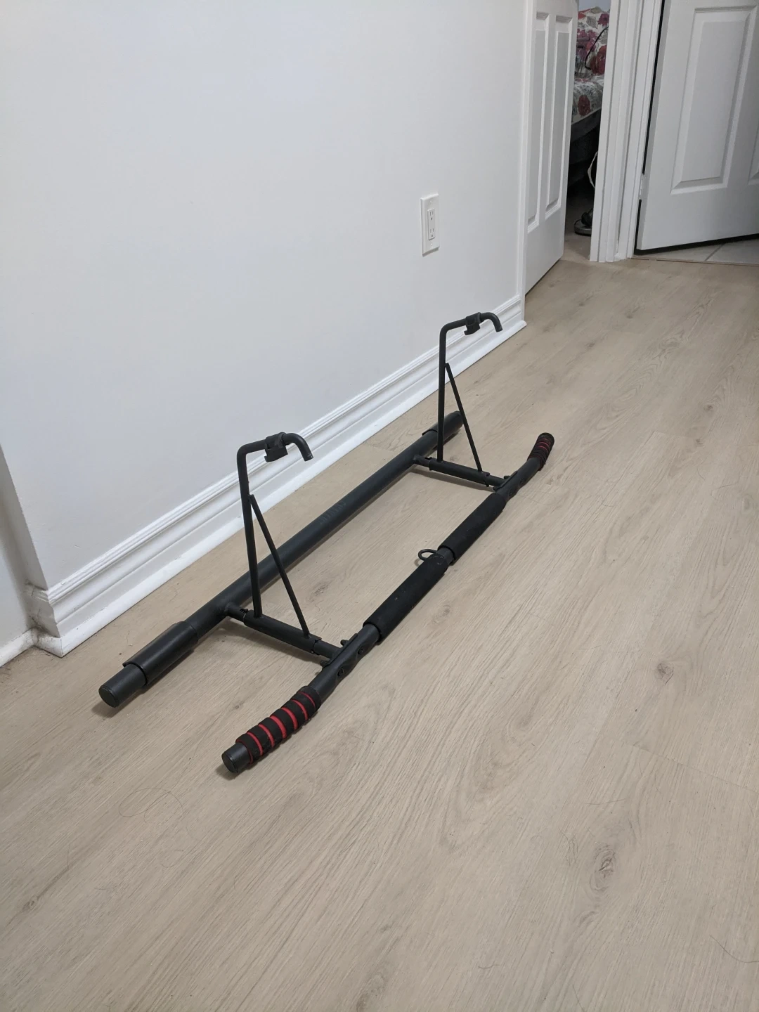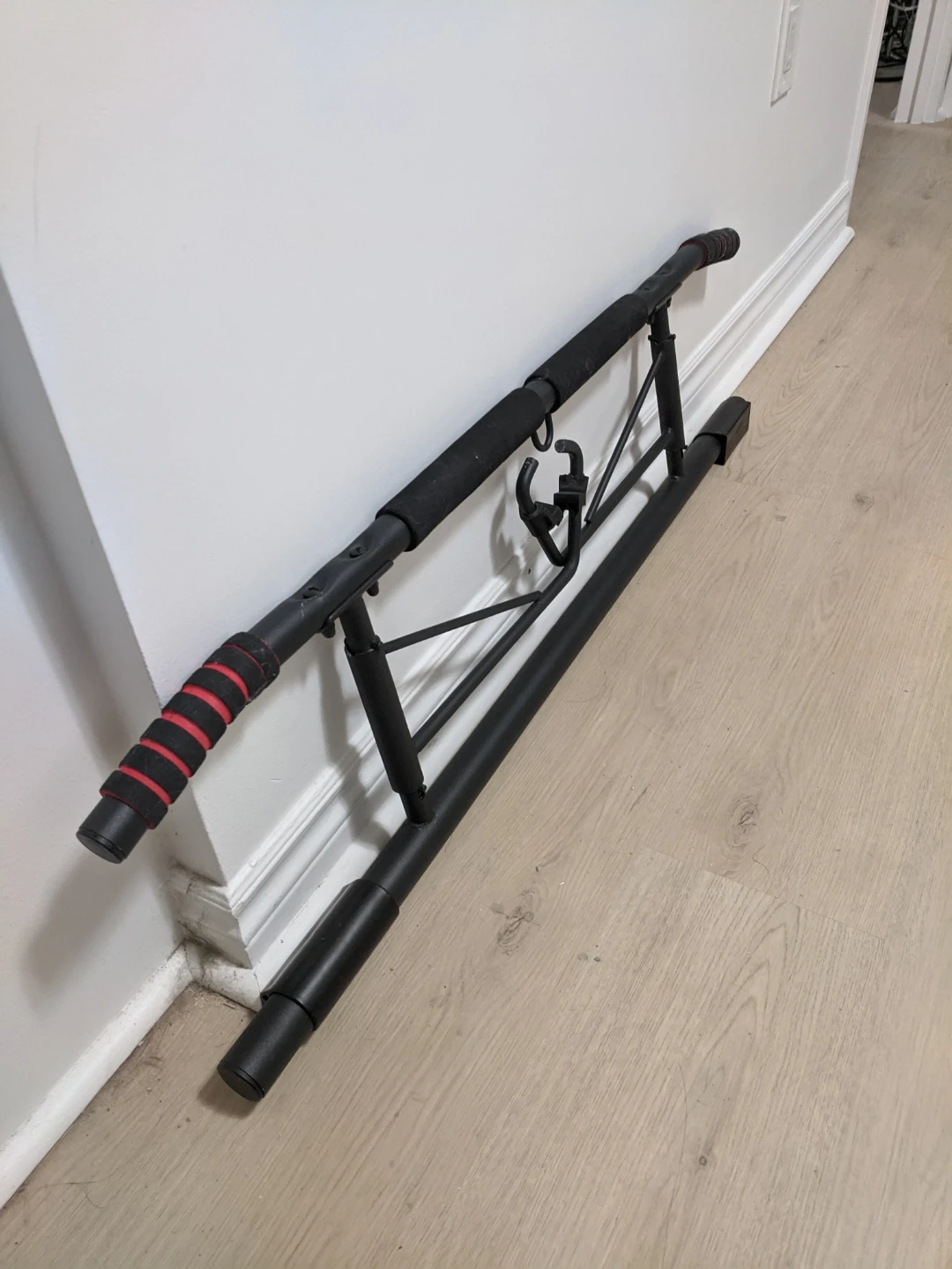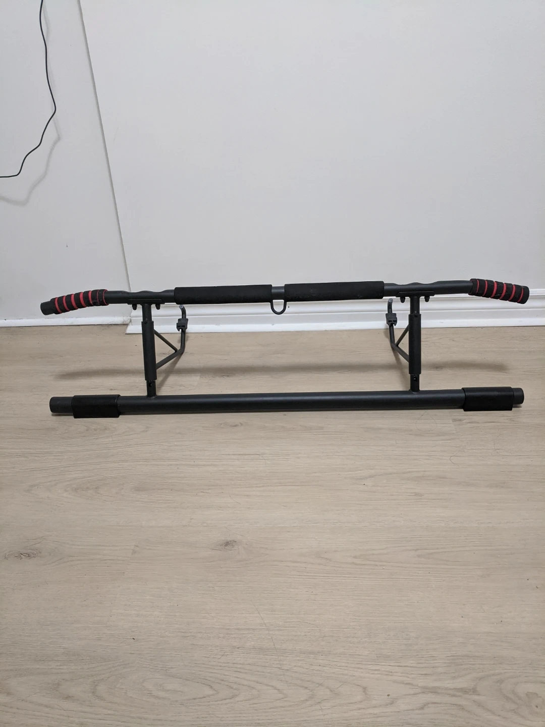 Black doorway pull-up bar with red accents on the grips. It's made of metal and has foam padding for comfort. This bar is adjustable for different doorway widths. It's great for home workouts!