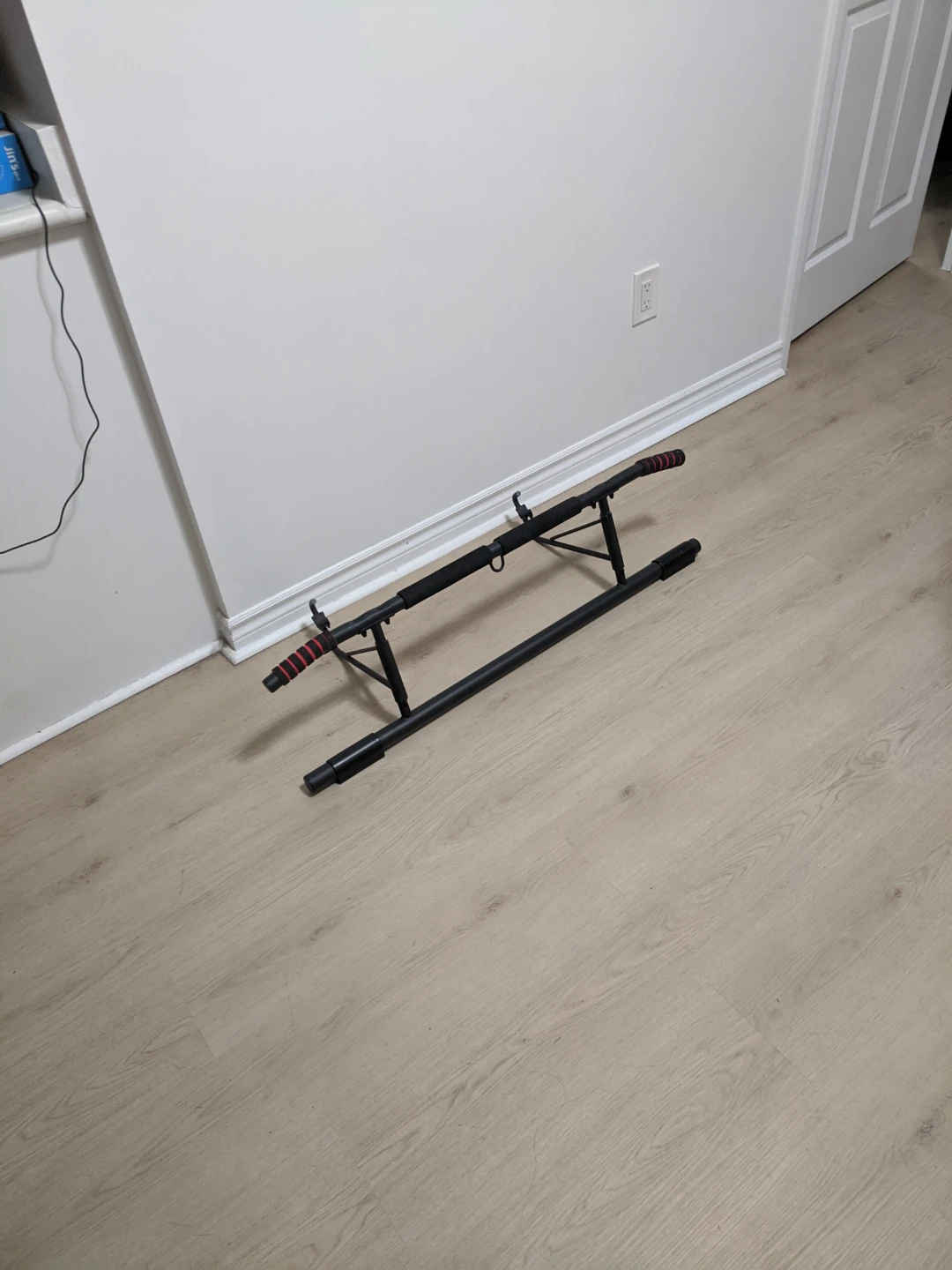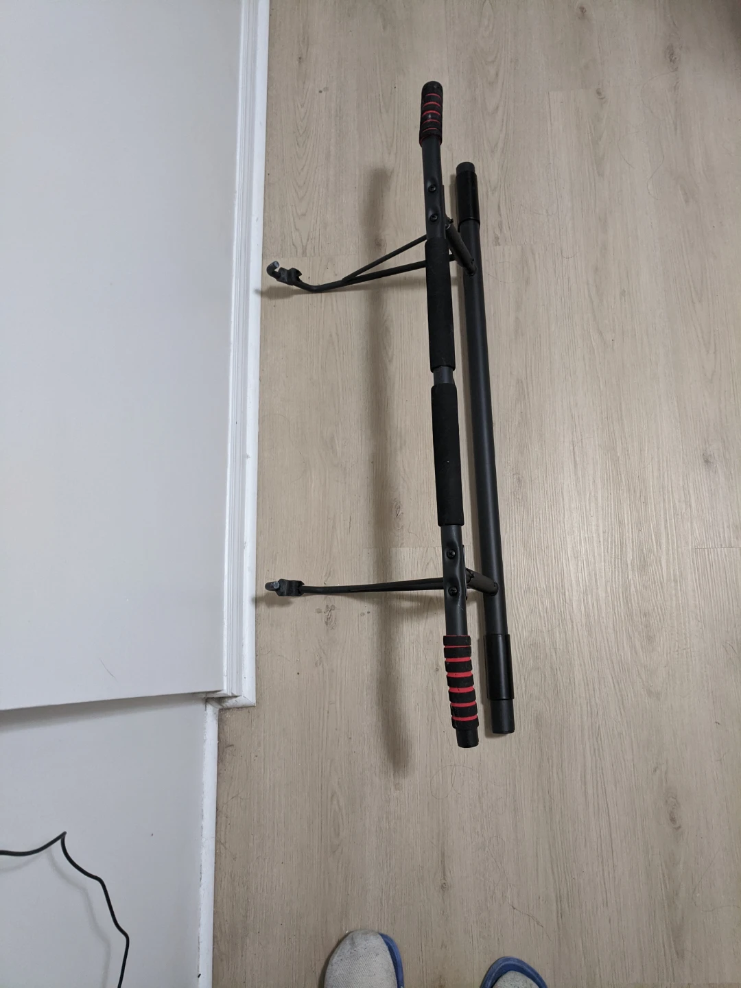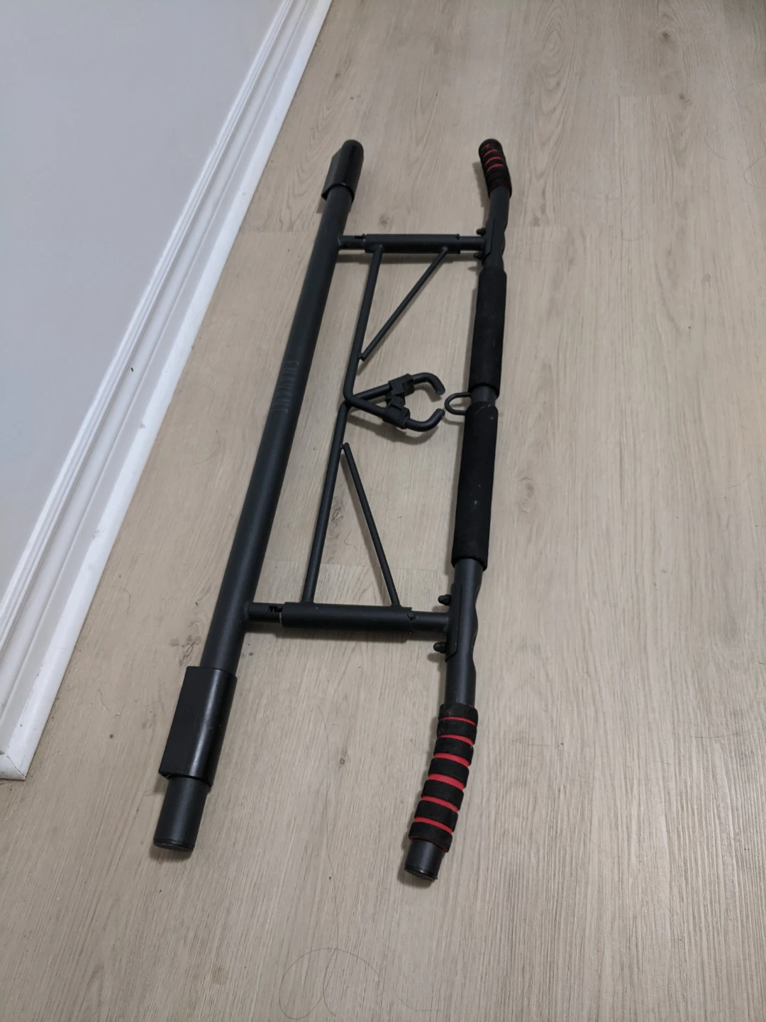 Black doorway pull-up bar with red accents on the grips. It's made of metal and has foam padding for comfort. This bar is adjustable for different doorway widths. It's great for home workouts!