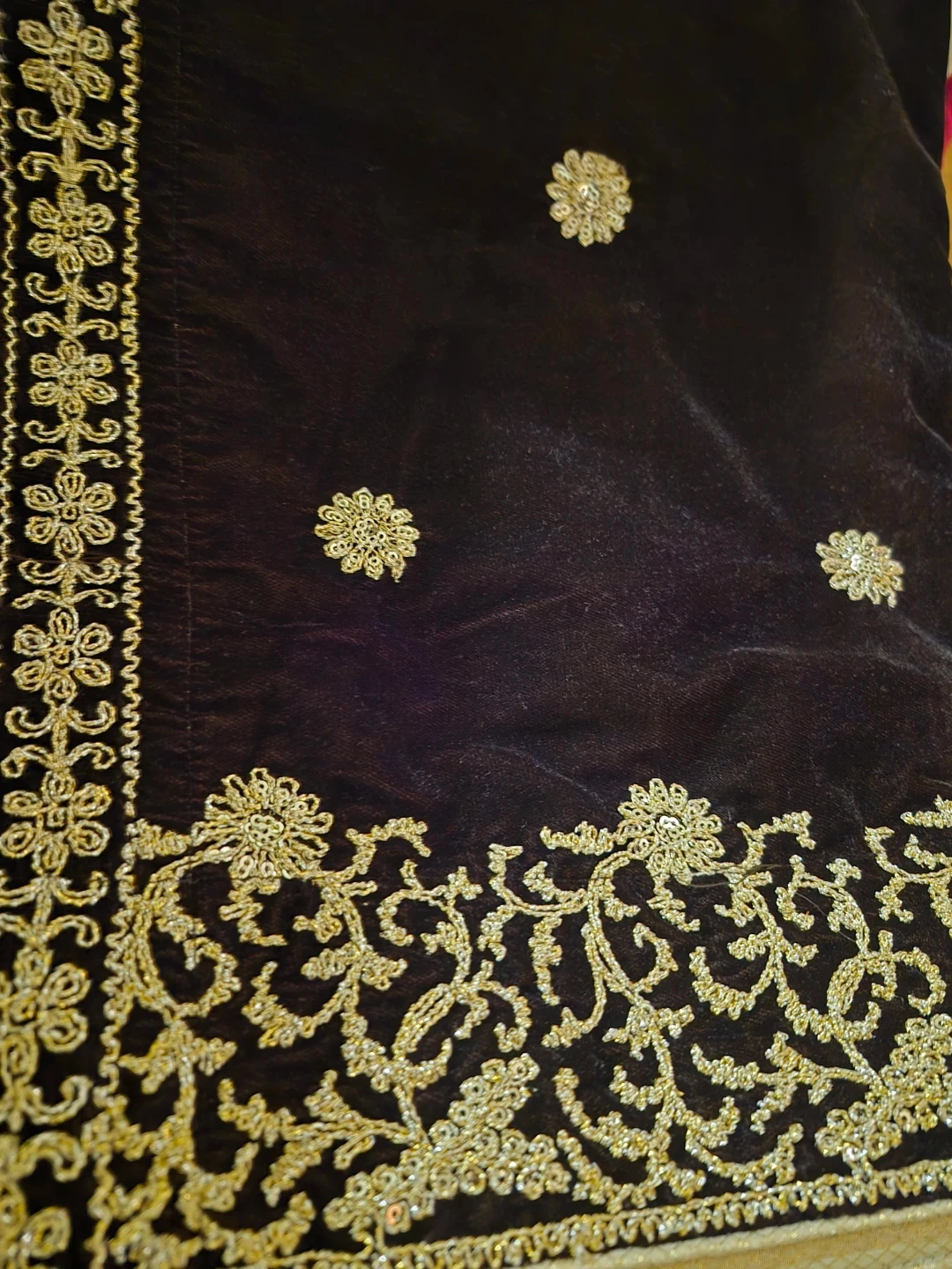 Beautiful dark brown velvet shawal with gold embroidery. Adds a touch of elegance for events , from my preloved collection