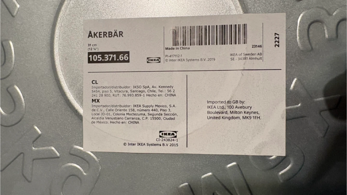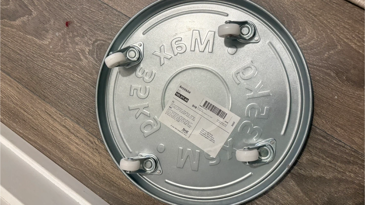 This is the IKEA ÅKERBÄR plant caddy. It's made of metal and has a maximum load capacity of 35kg. The diameter is 31 cm.