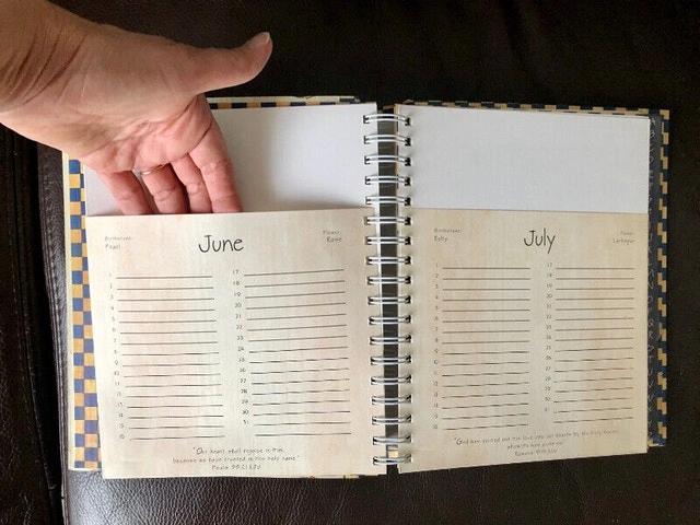 Never used. Stay organized with all those cards you purchase for your family and friends. This book is a great place to keep them until you need them - you won’t be searching for them anymore. Birthday, anniversary, sympathy, get well.... You can record names and dates by month. A convenient address book is at the back of the book. Brampton, near Queen and Kennedy.