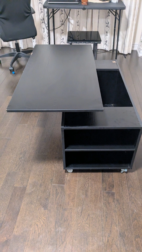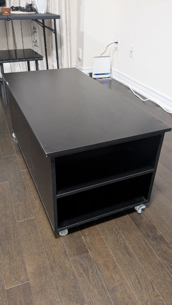 A black coffee table with wheels and storage space. It has a lift-top feature that can be used as a desk or dining table. There are two shelves for storage underneath.