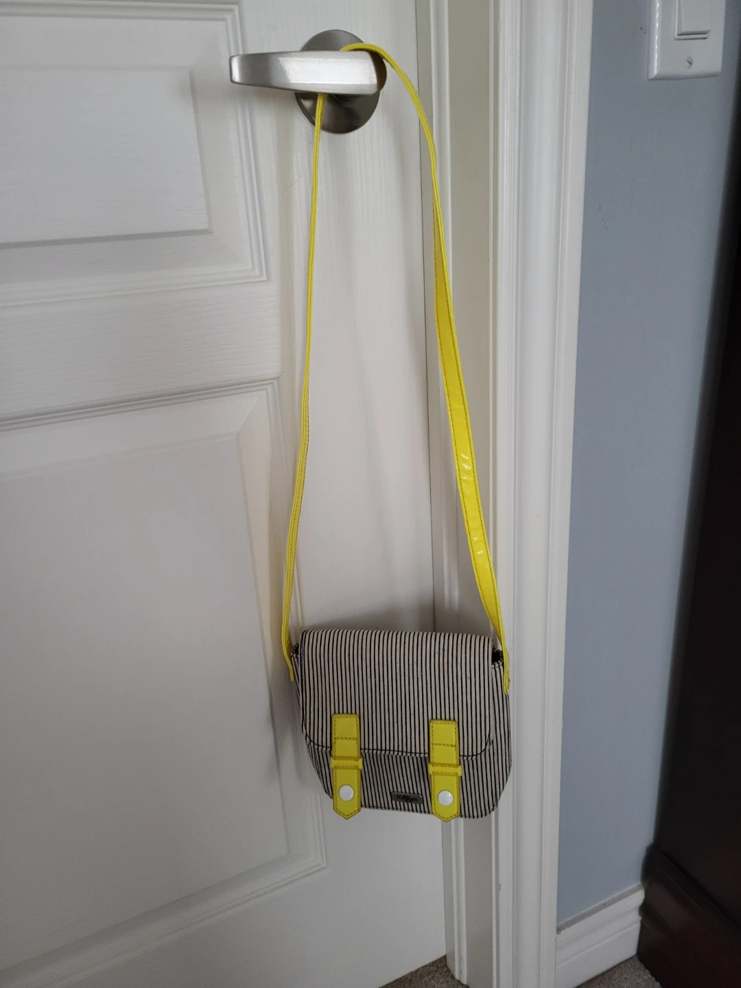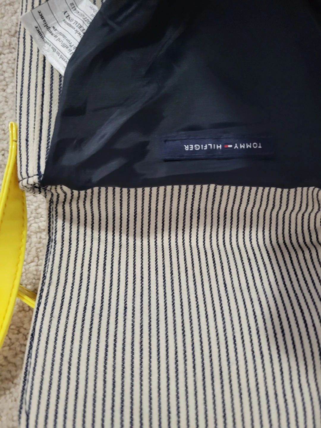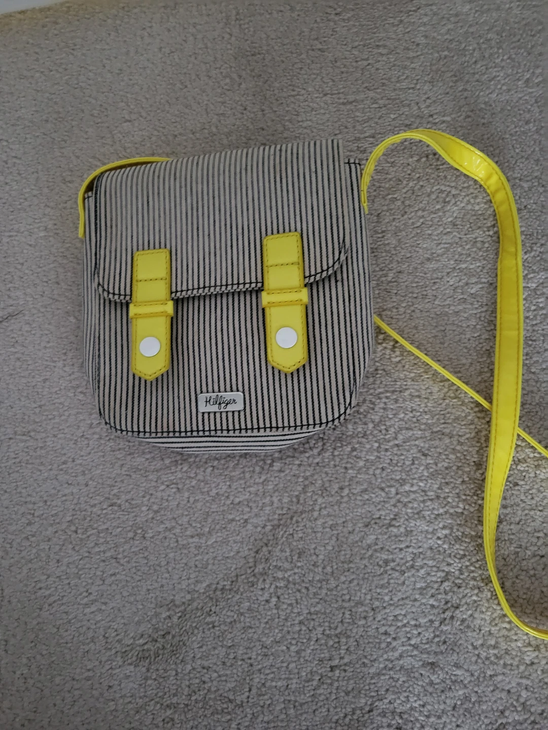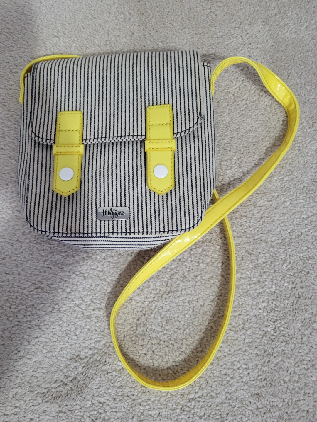 Tommy Hilfiger crossbody bag with black and white stripes and yellow accents! It's in great condition and perfect for carrying your essentials.for small girls.