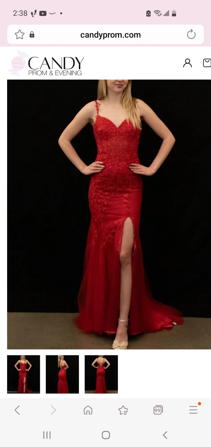 This red lace prom dress features a sweetheart neckline and a daring slit. It's designed with spaghetti straps and a flowing tulle skirt. It would be perfect for a formal event or prom night!