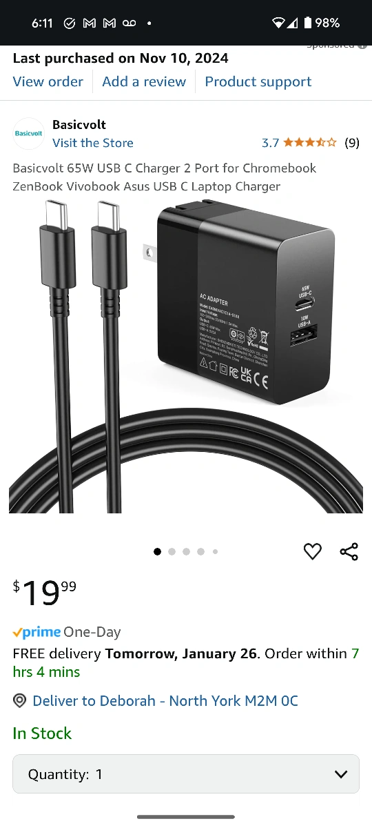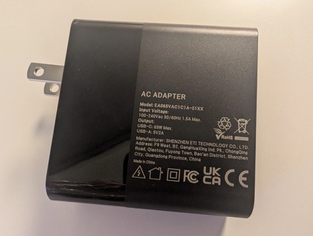65W USB C charger. Two ports. USB-A and USB-C. Includes cable. Charges Chromebooks and Asus Zenbook VivoBook. selling because i missed the return date, i ordered the wrong one for what i needed.