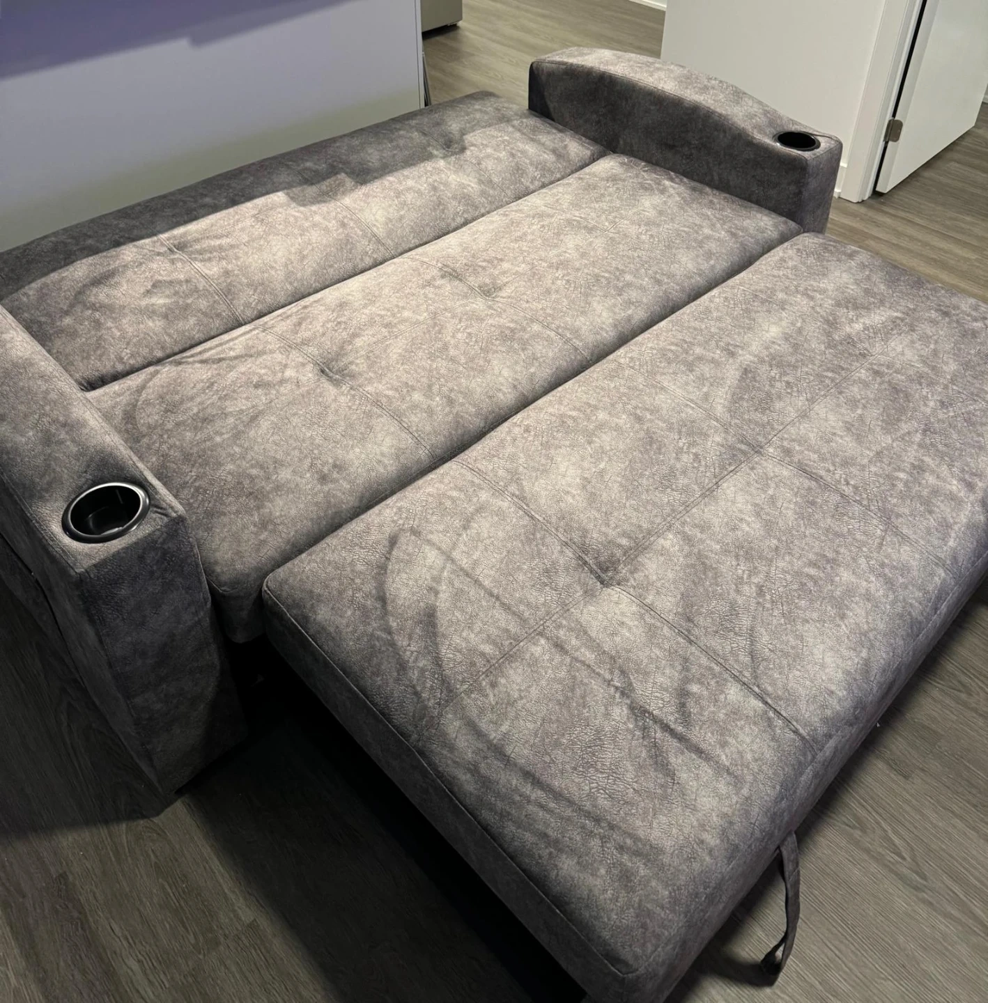 This versatile sofa bed easily converts for lounging or sleeping. It's upholstered in a soft, textured grey fabric and features built-in cup holders on the armrests.