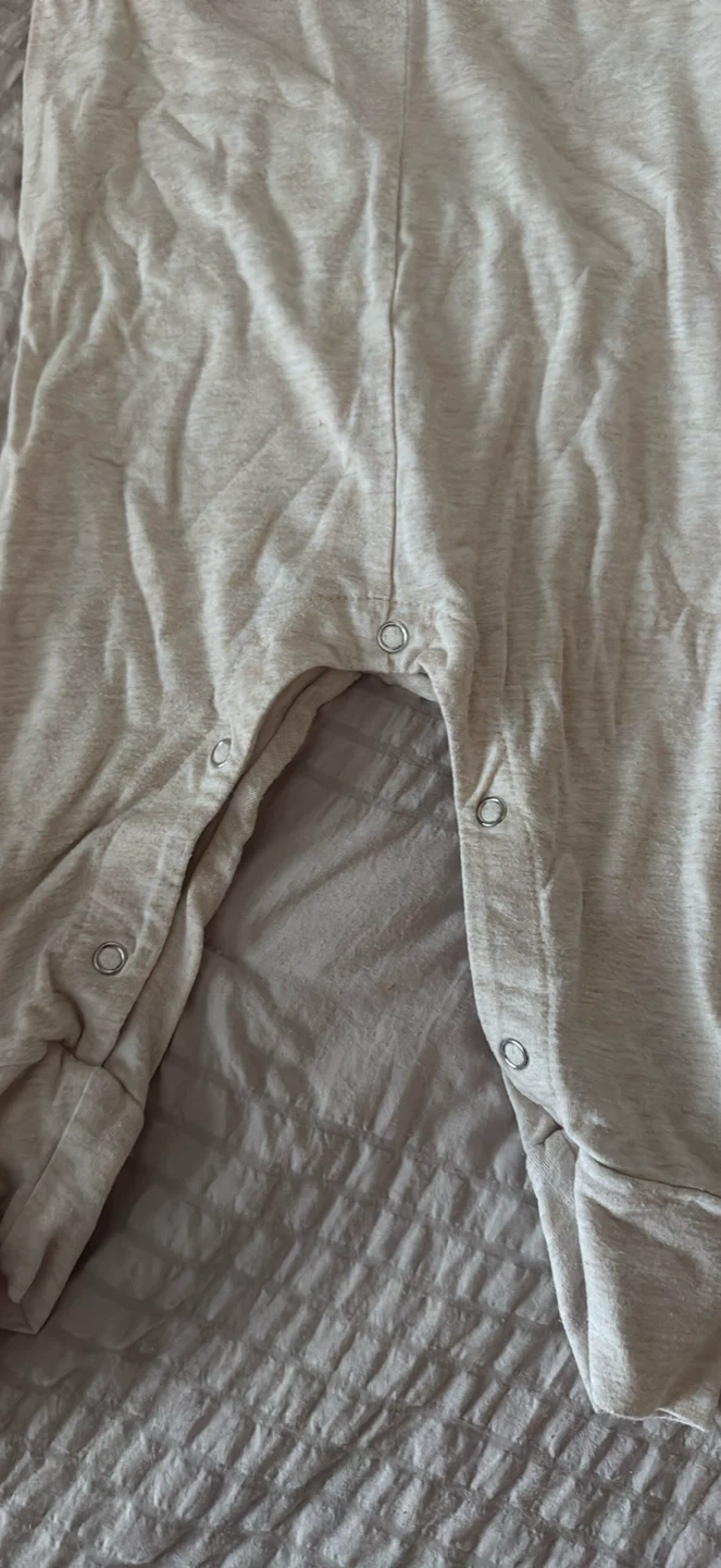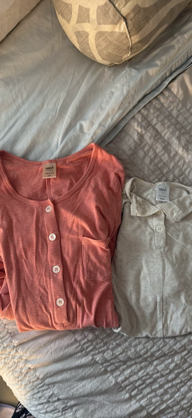 Two pieces from Smash + Tess, including a coral pink henley top women’s size small and a beige baby romper in size 6-12 month. The romper has snap closures for easy diaper changes. Soft fabric for comfort.