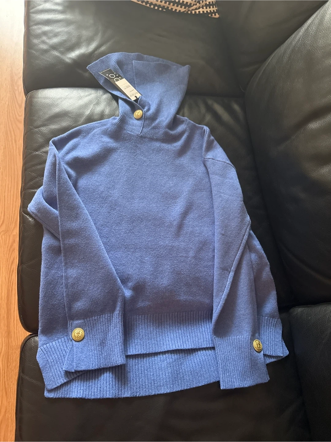 A lovely blue turtleneck sweater from D.O. would be a great addition to your wardrobe. It features stylish gold buttons on the collar and cuffs