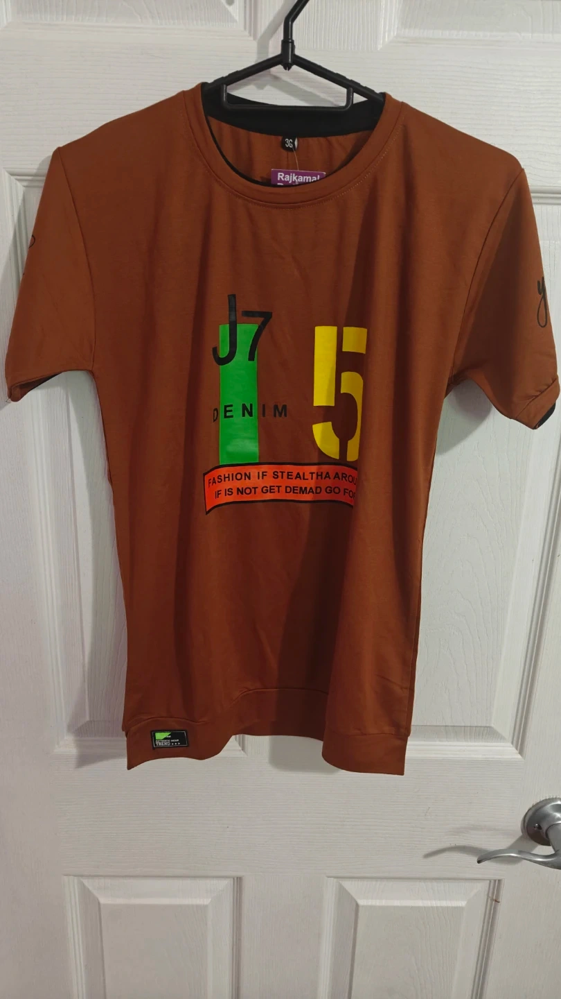 This is a brown short-sleeved t-shirt with a large "J7 DENIM" graphic on the front. It features a "FASHION IF STEALTH AROUND IF IS NOT GET DEMAD GO FOR IT" text detail. The material is cotton.