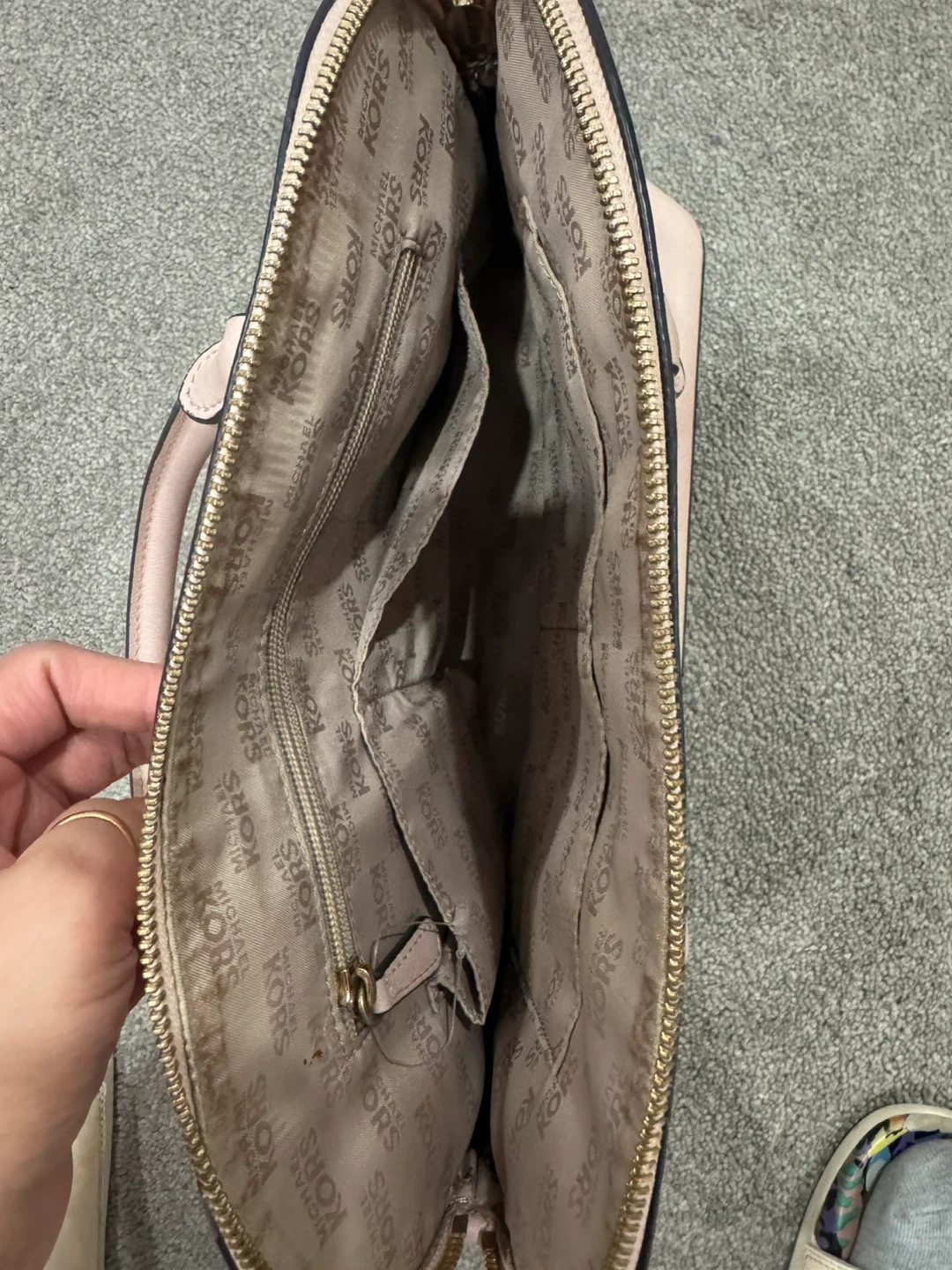Michael Kors satchel handbag in a light pink colour. It has a zip closure and multiple interior pockets. Gold-tone hardware is present.