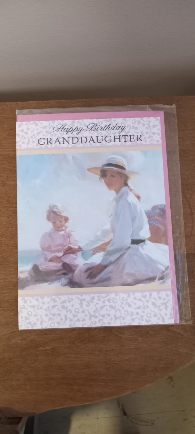 A 'Happy Birthday Granddaughter' card with a beautiful beach scene design. Inside, it reads 'The memories we have made together are cherished ones. Each birthday brings another memory to hold close to the heart. Have a very special day! Happy Birthday With Love.' It's still sealed in plastic packaging. This card is perfect for wishing your granddaughter a happy birthday!