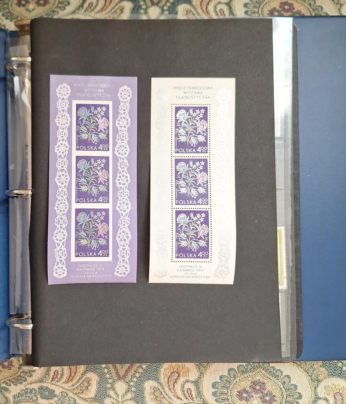 Two sheets of Polish postage stamps featuring floral designs. These stamps are from the International Philatelic Exhibition, Socphilex IV, held in Katowice in 1974. Each sheet has three stamps with a denomination of 420 Zloty.