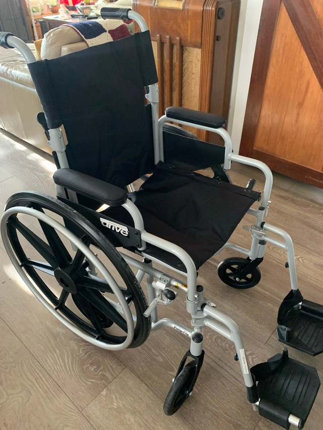 Selling a barely used Drive Medical 2-in-1 wheelchair in excellent, like-new condition. It easily converts from a standard wheelchair to a transport chair by detaching the large rear wheels for a lightweight, caregiver-push setup. Features smooth-rolling, durable wheels, a folding frame for easy storage and trunk transport, comfortable padded armrests, and swing-away removable footrests. The seat and backrest fabric is sturdy and black, with no rips or wear. It's super clean, rolls smoothly, and has no damage. Used only a few times. Perfect for appointments, post-surgery recovery, temporary mobility needs, or travel as it's light and compact in transport mode. Selling because it's no longer needed. Pickup in Kitchener. Asking $375 or best offer.