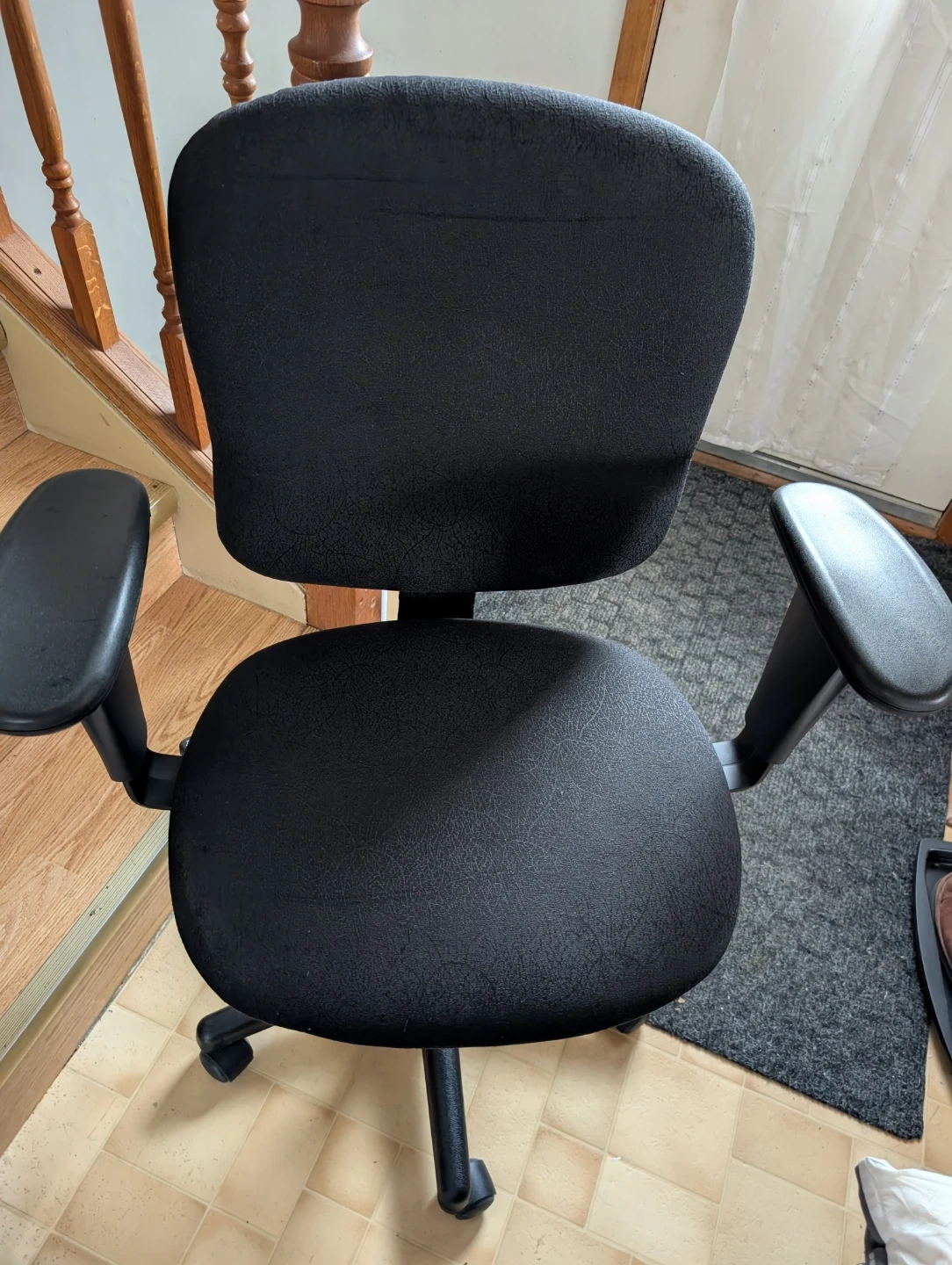 This is a black office chair with adjustable height and padded armrests. It's upholstered in fabric and has a five-star base with wheels for easy mobility. The chair offers tilt and lock functions for customized comfort. Suitable for home or office use.