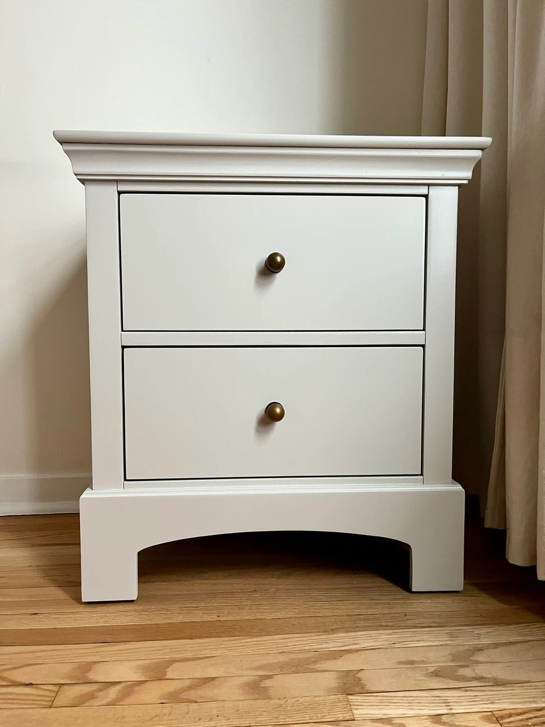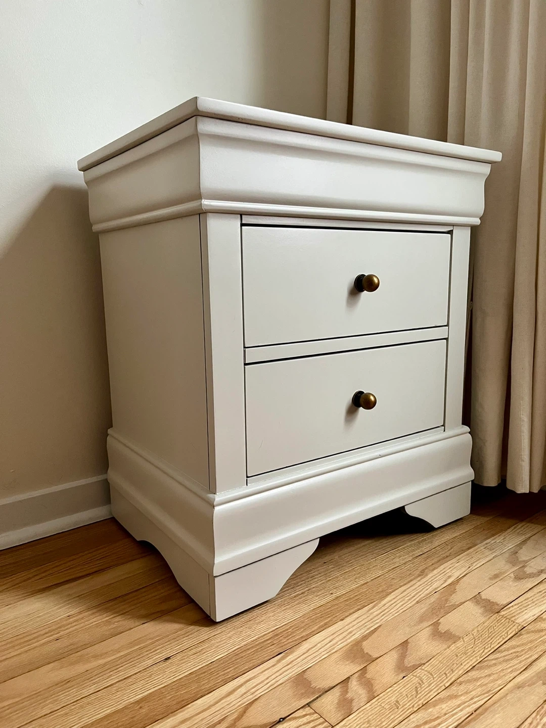 Upgrade your bedroom with this beautifully refinished bedroom furniture set. Each piece has been sanded, primed, and painted in a clean, modern off-white / cream finish and sealed for long-lasting durability. Cohesive style, timeless look, and unique shapes.