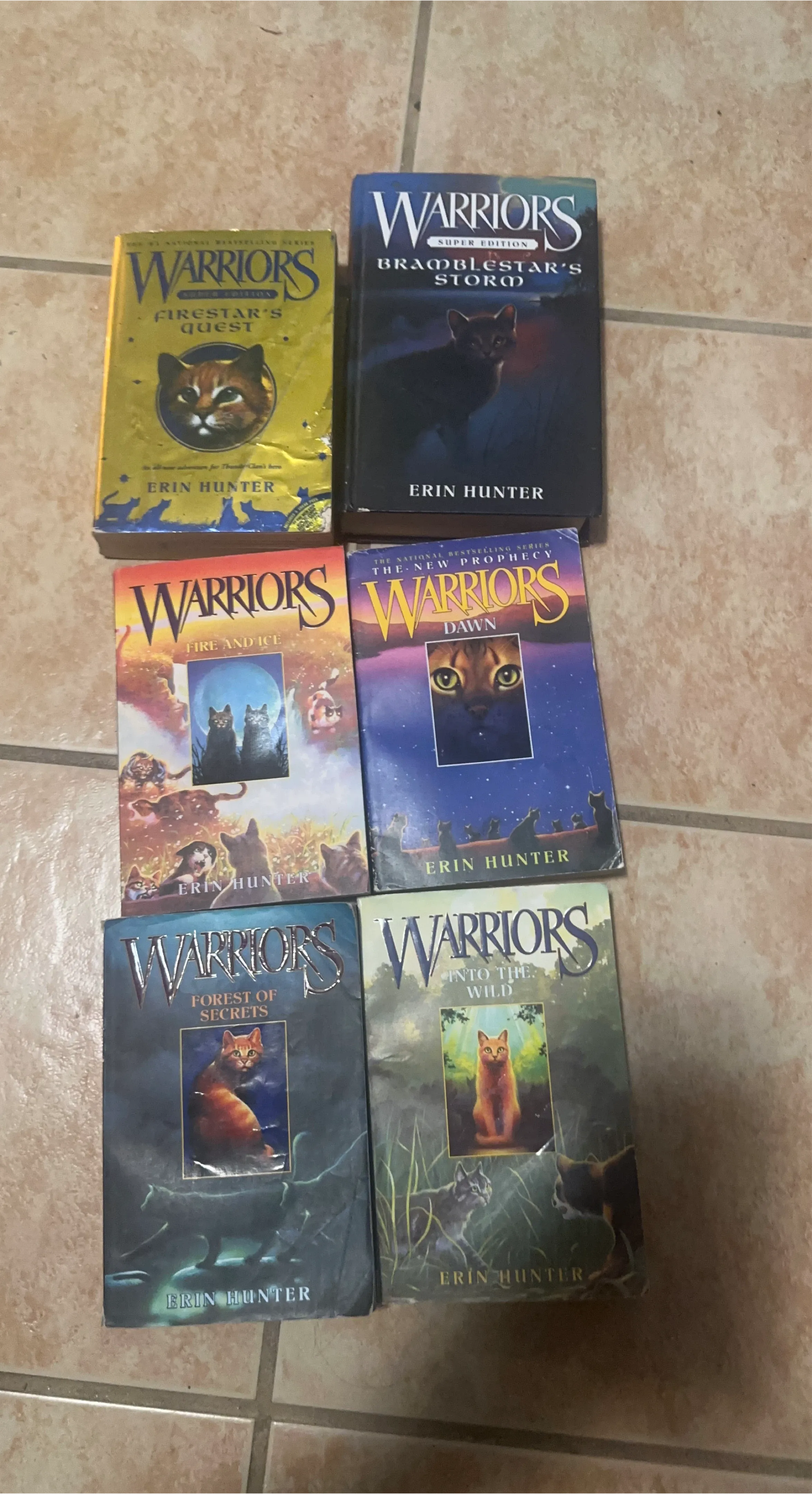 This is a set of 6 Warriors books by Erin Hunter. Titles include Firestar's Quest, the 1ST EDITION Bramblestar's Storm, Fire and Ice, Dawn, Forest of Secrets, and Into the Wild. These are popular fantasy novels for young readers.