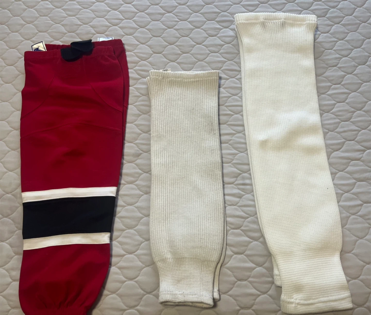 Selling 3 sets of hockey socks! You'll get one pair of Bauer Team socks in size S/M, one pair of white socks that are 24", and one pair of red Force socks in intermediate size.