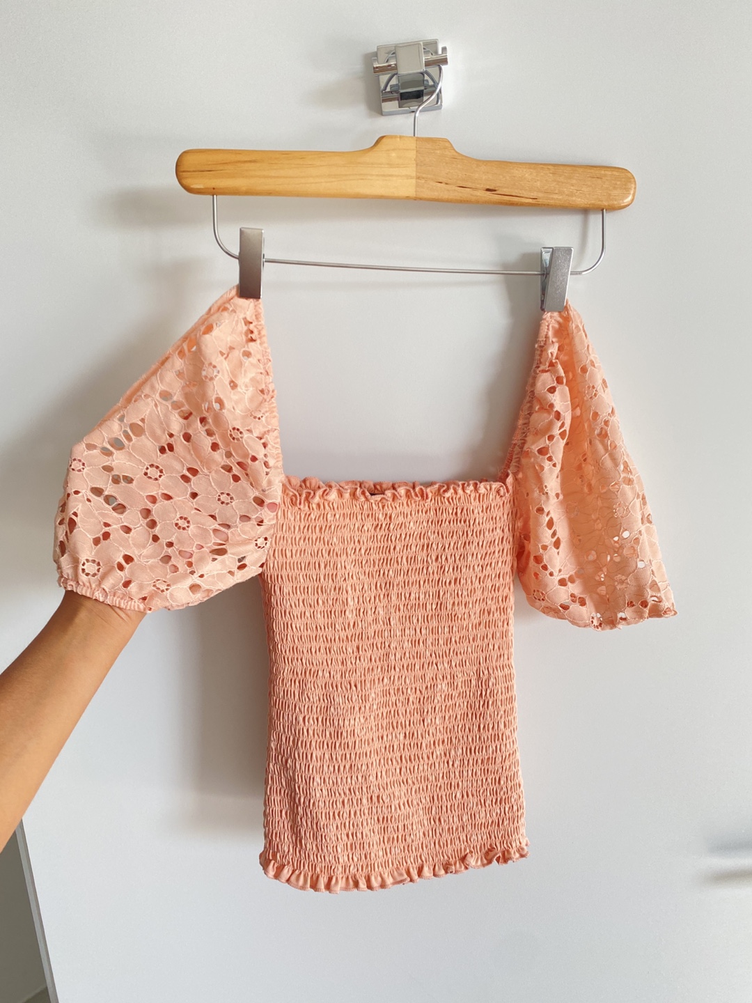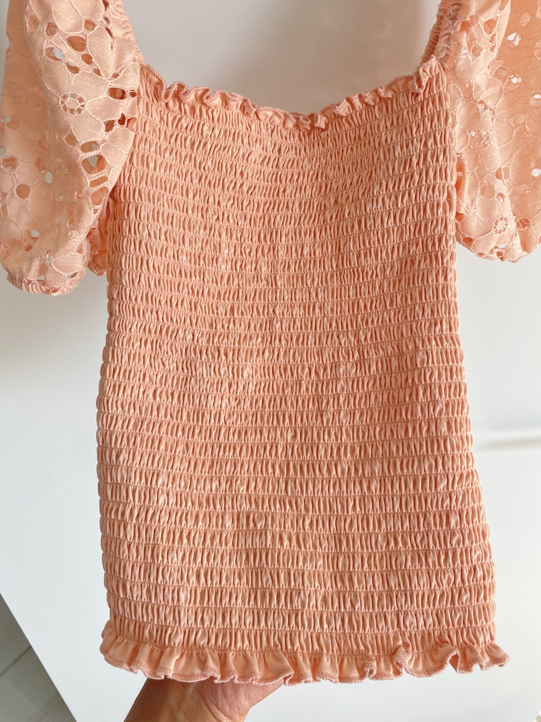 Selling a cute peach smocked top with puff sleeves! It's a size small and features a smocked bodice and lace detailing on the sleeves.