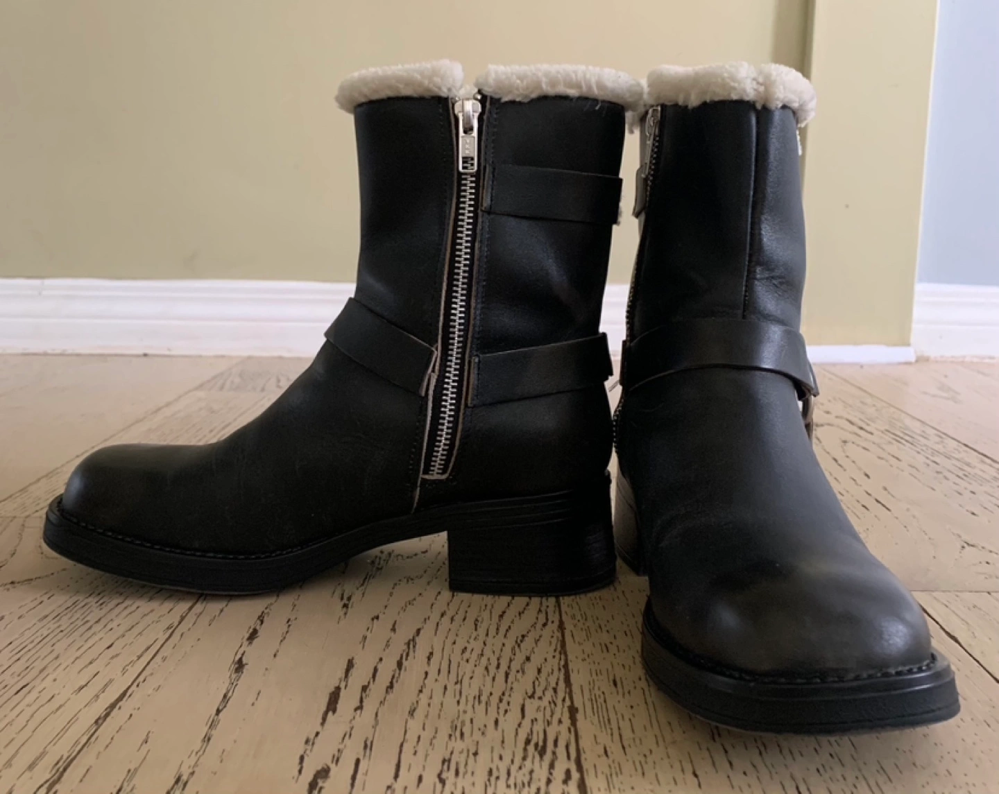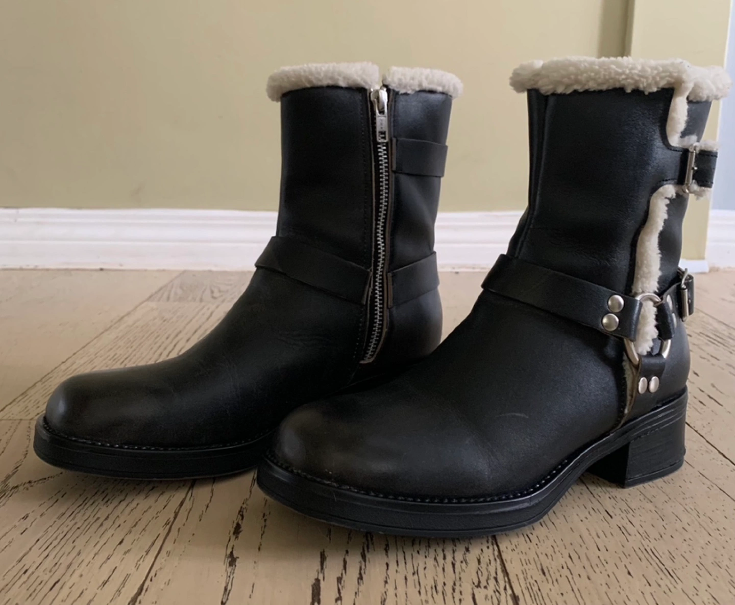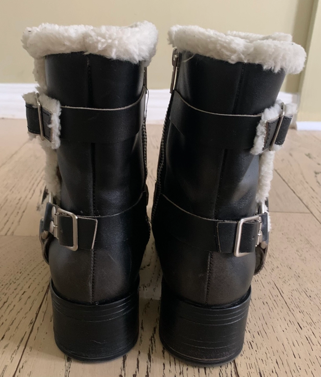 Black distressed leather ankle boots. Features shearling lining, side zipper, and buckle details. Low block heel. Excellent for colder weather, very warm.