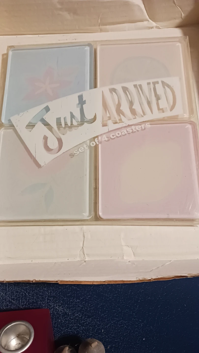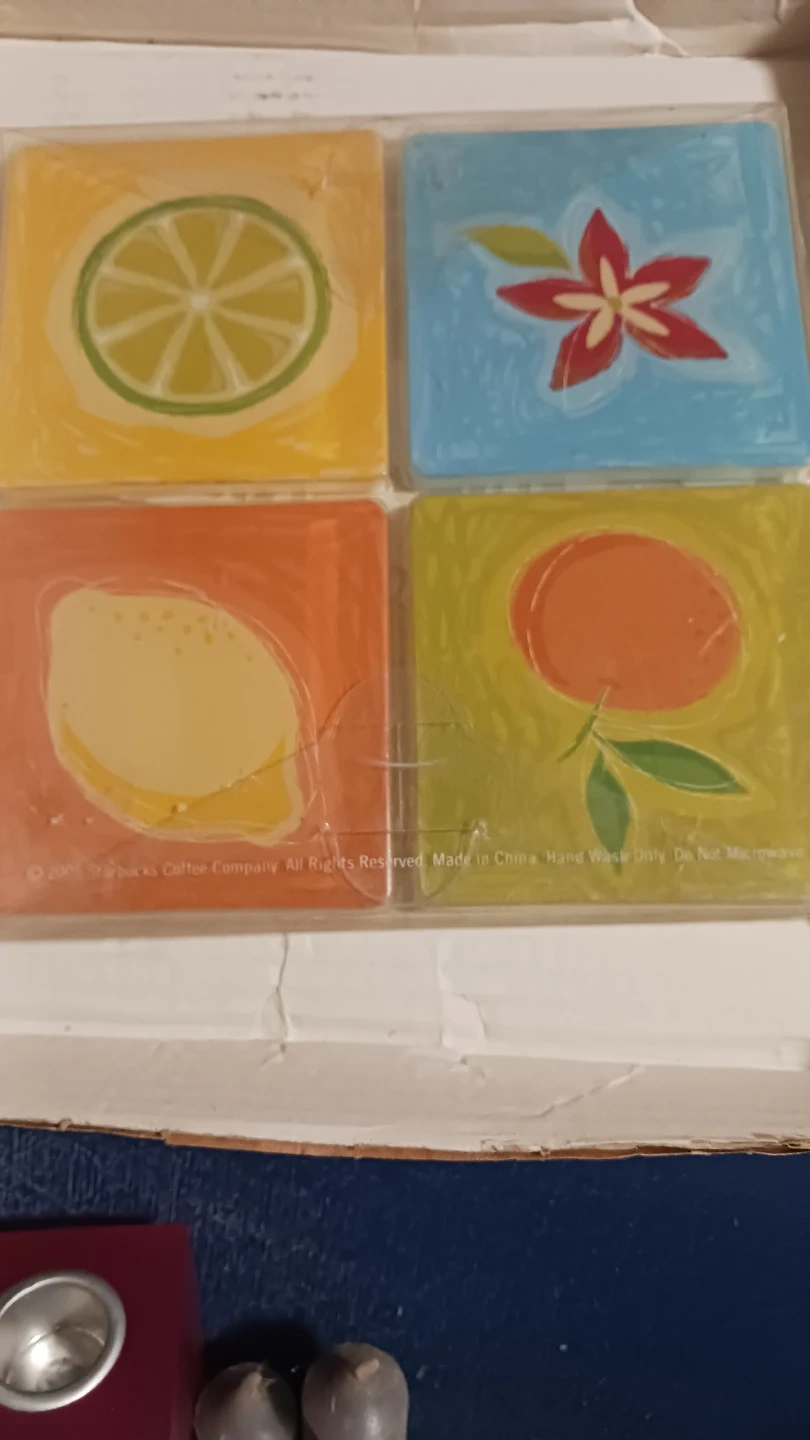 Set of four Starbucks coasters featuring fruit and flower designs. Made in China. Hand wash only. Do not microwave. Never used, turned only for best view!