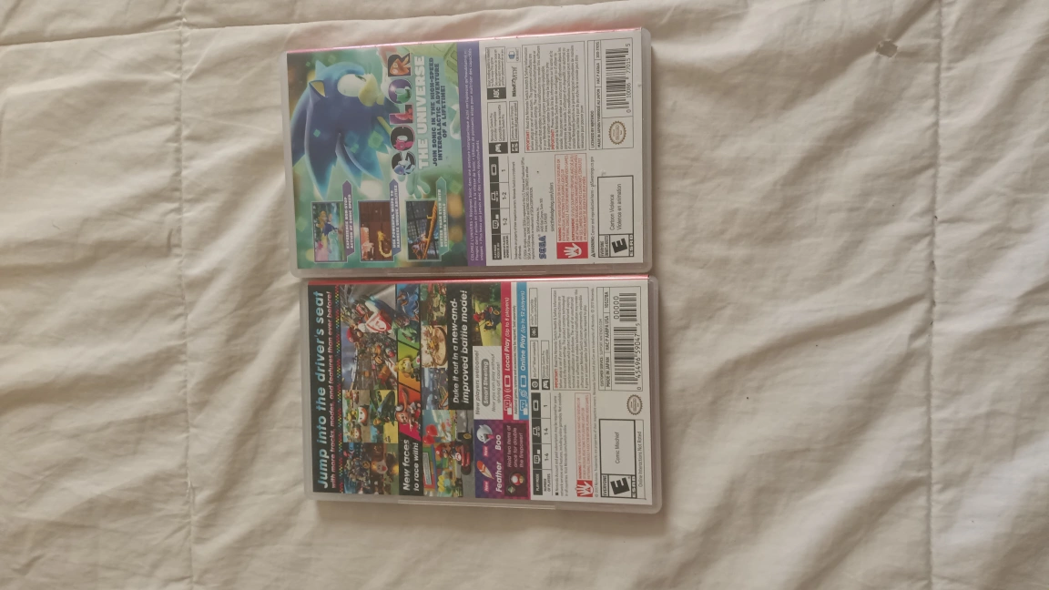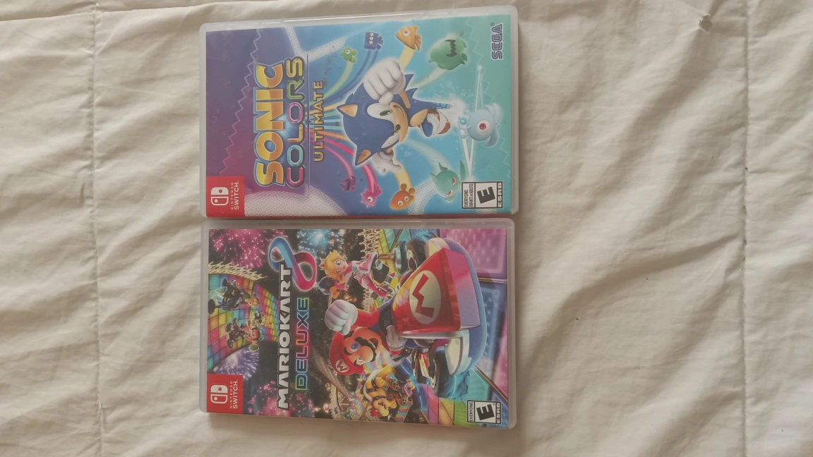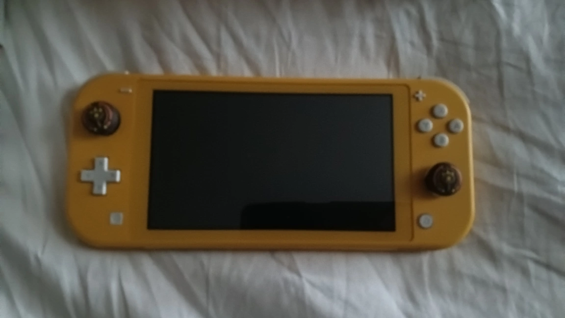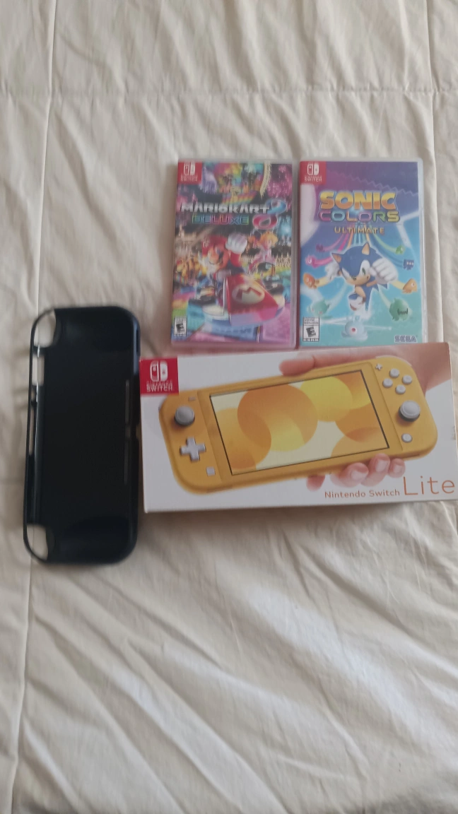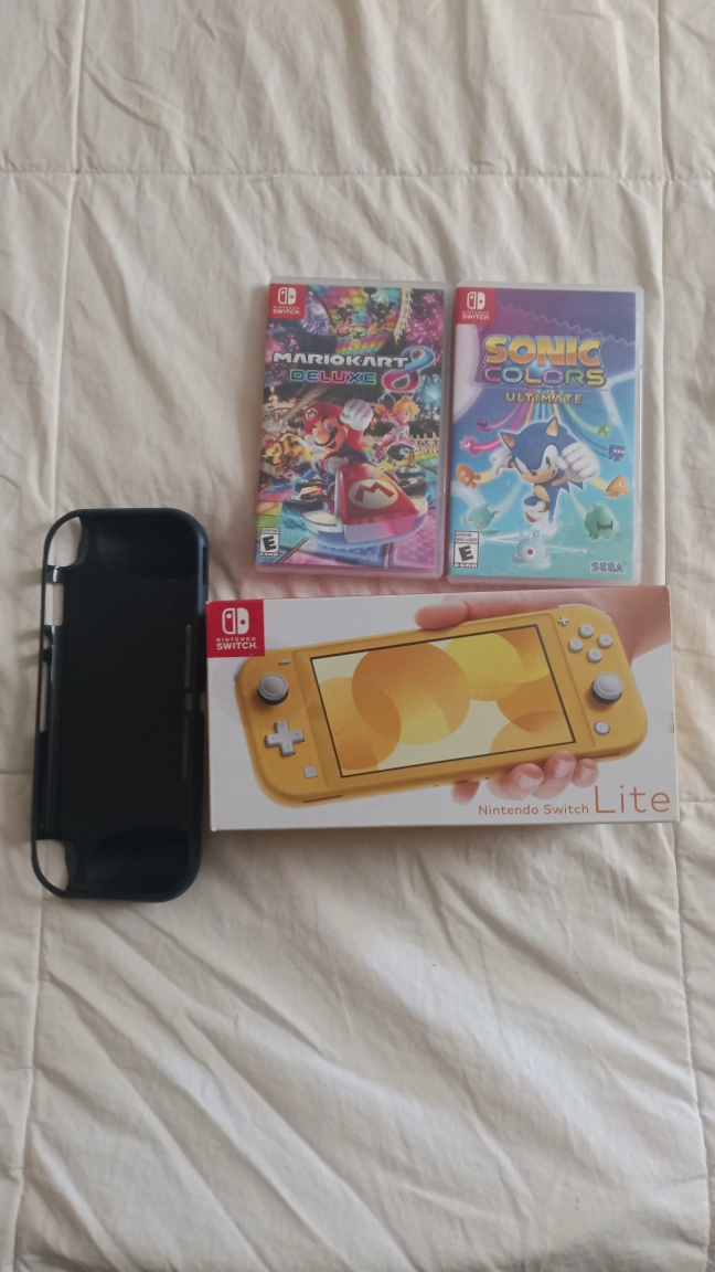 Yellow Nintendo Switch Lite console, includes two games: Mario Kart 8 Deluxe & Sonic Colors Ultimate.