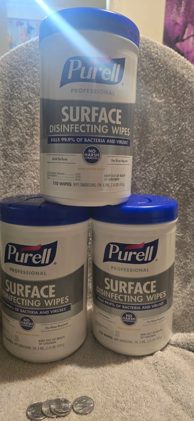 I have 3 canisters of Purell Professional Surface Disinfecting Wipes for sale! These wipes kill 99.9% of bacteria and viruses and have a fresh citrus scent. Each container has 110 wipes with dimensions of 7in x 8in