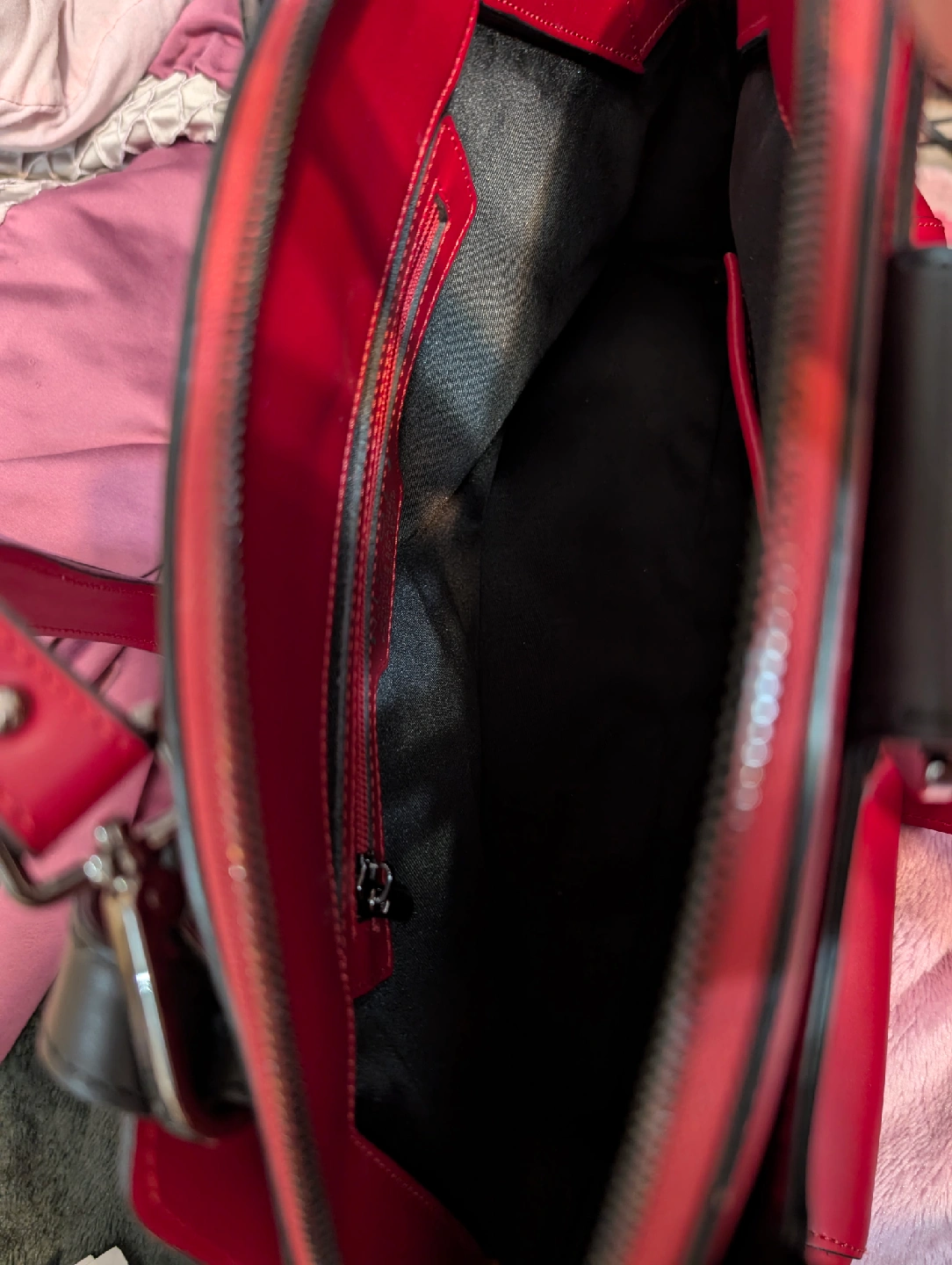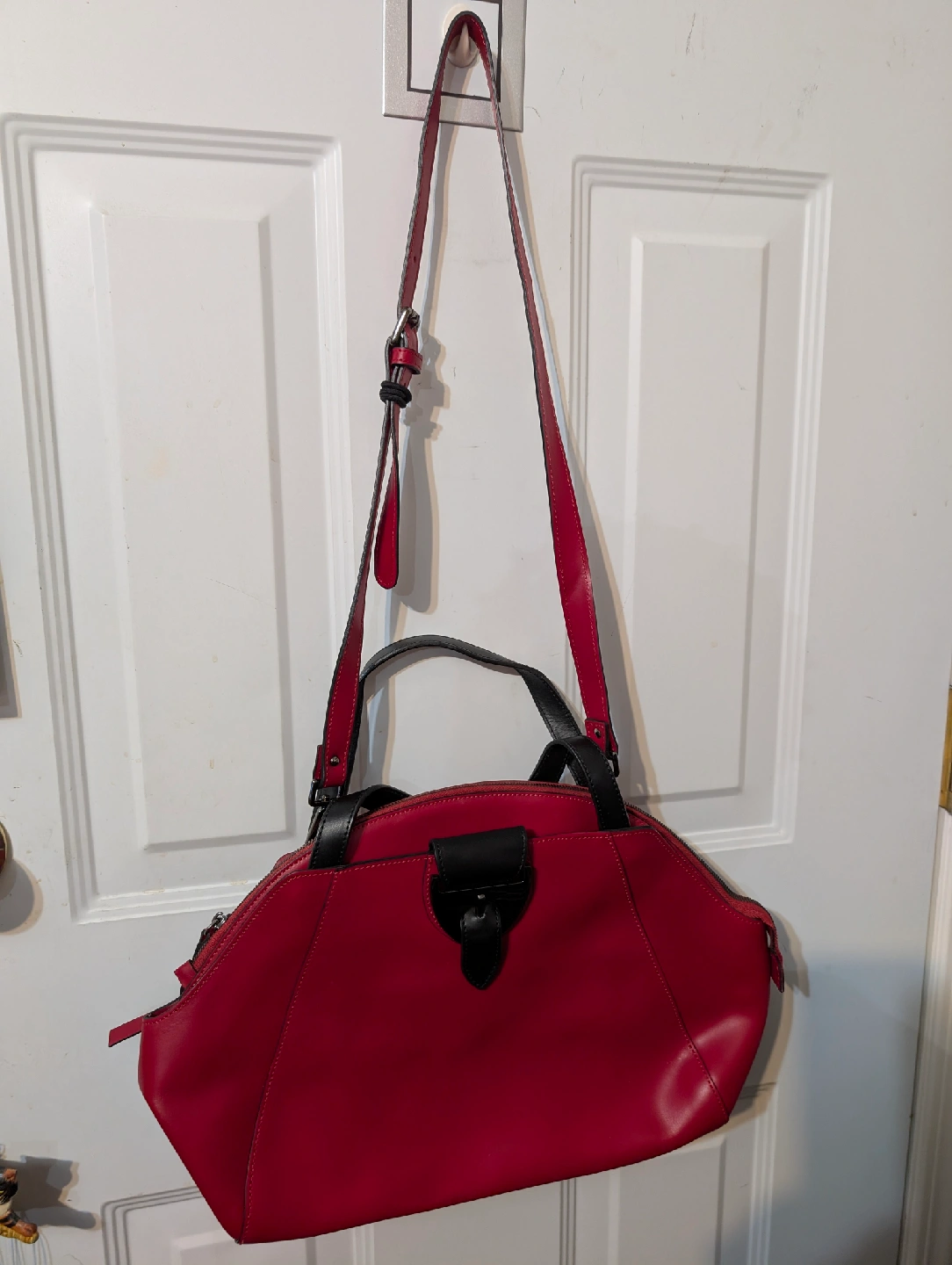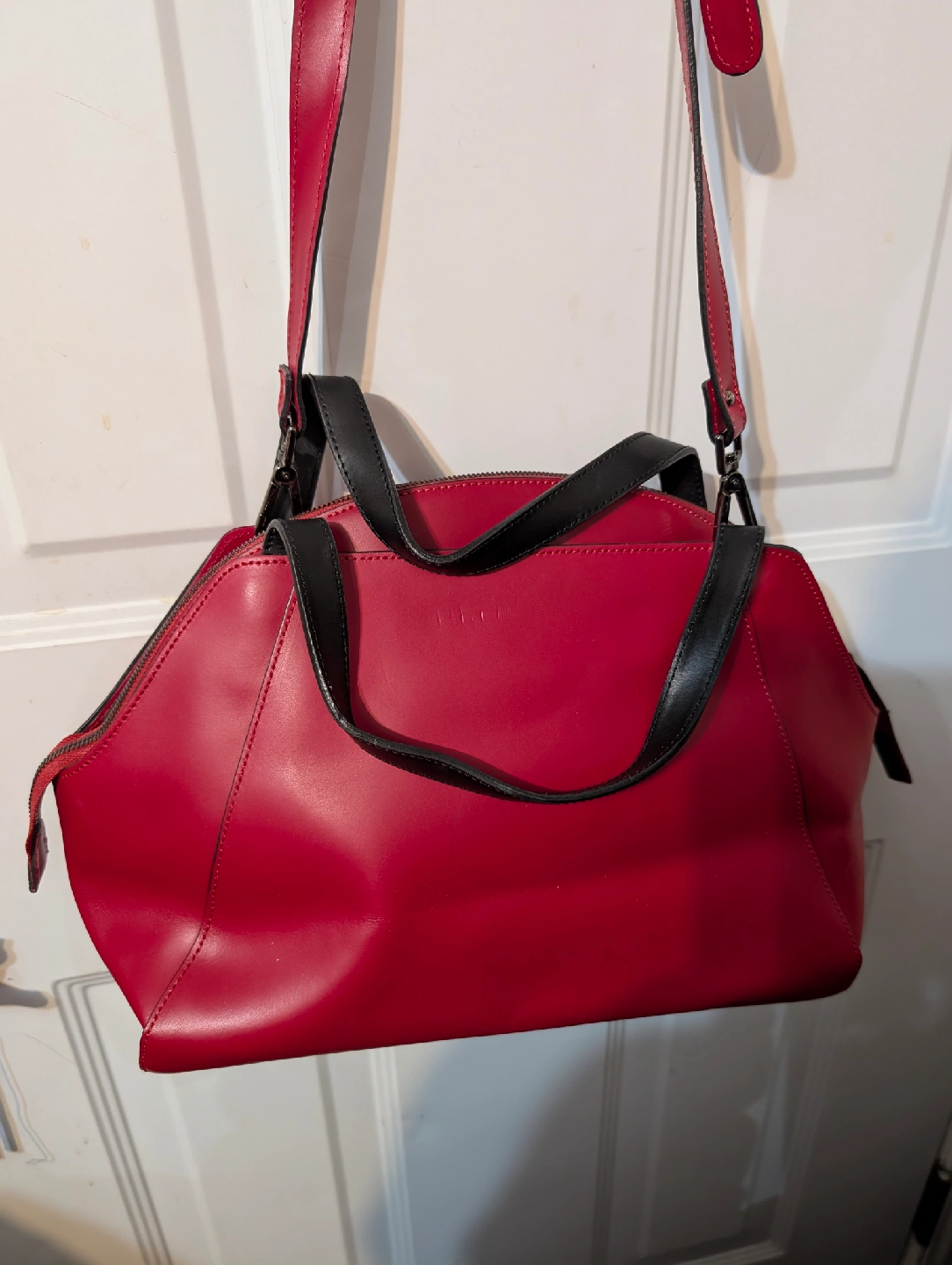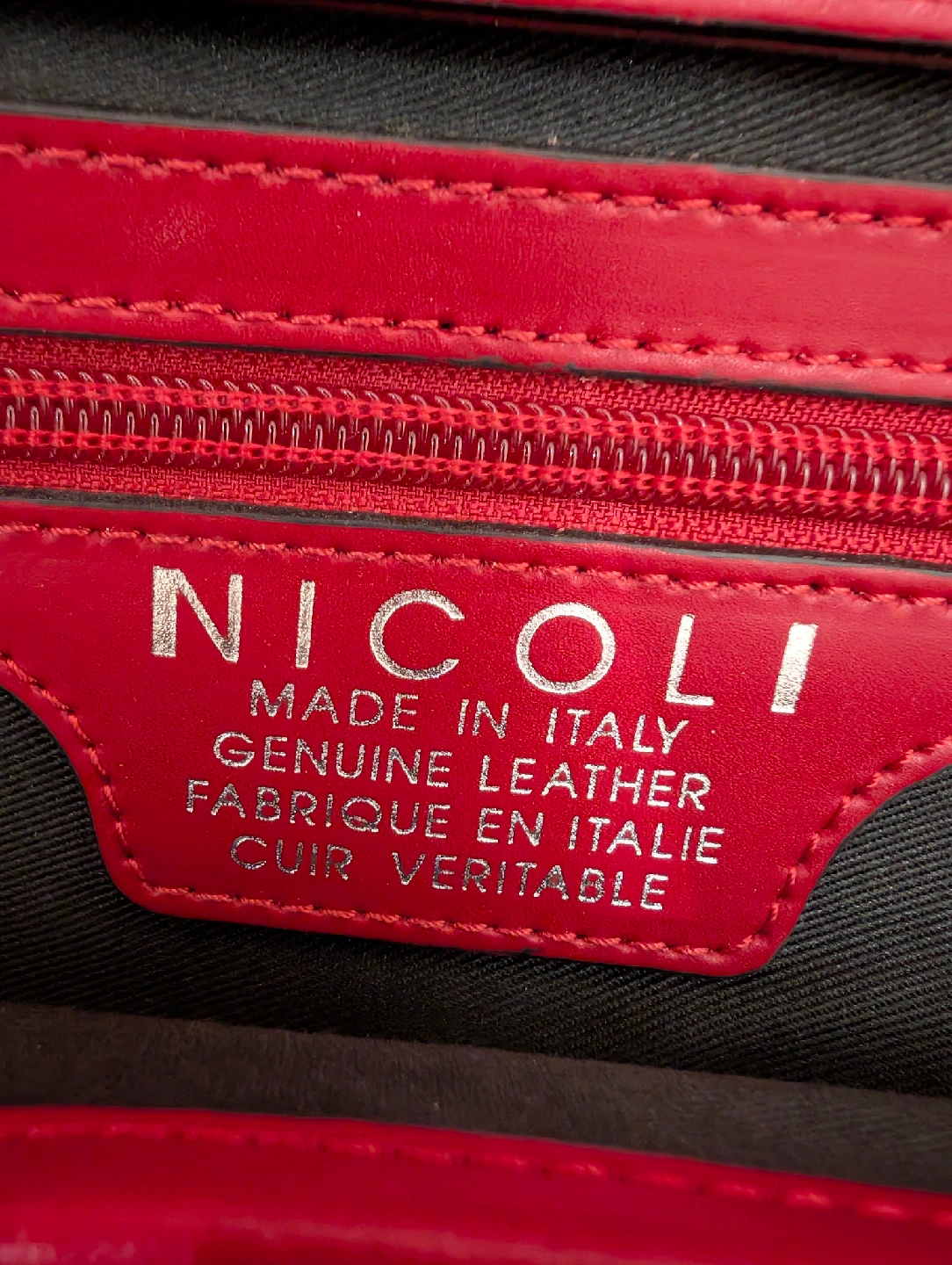 Selling a vibrant red Nicoli handbag, made in Italy with genuine leather. This stylish medium size purse features black accents and a unique design. Perfect for adding a pop of colour to your outfit!