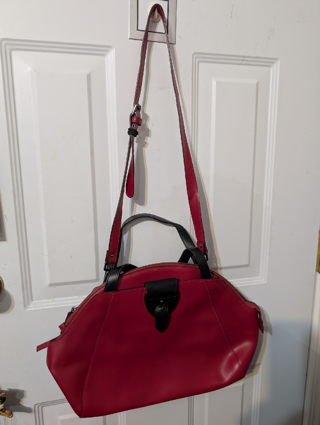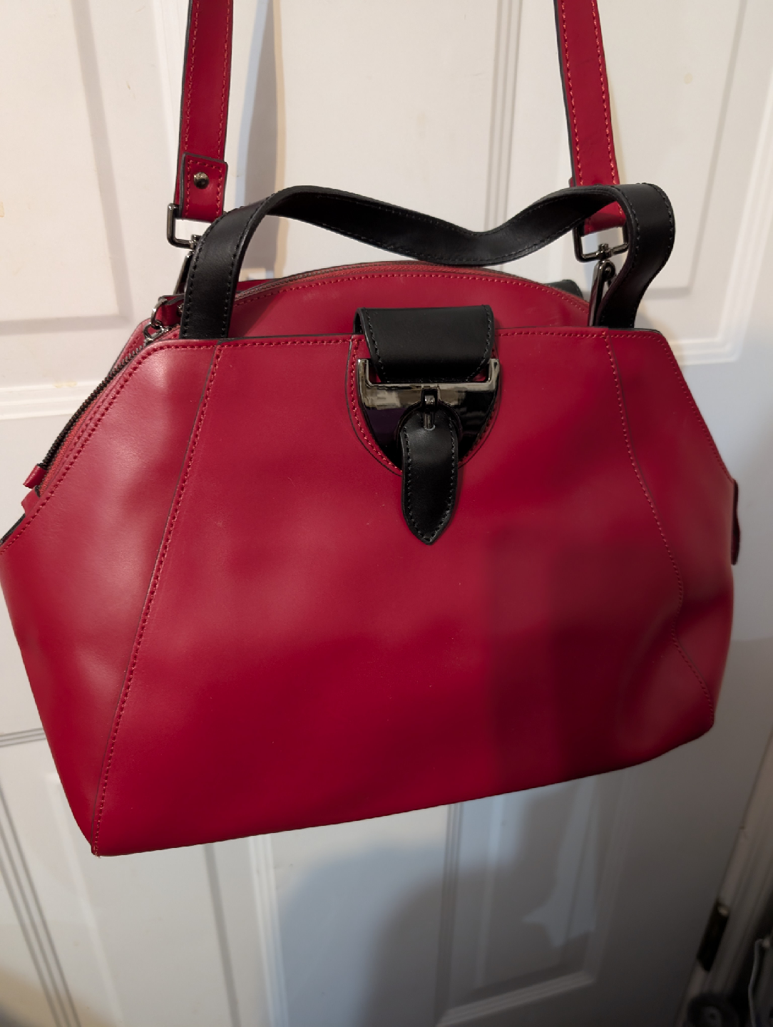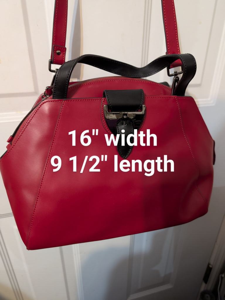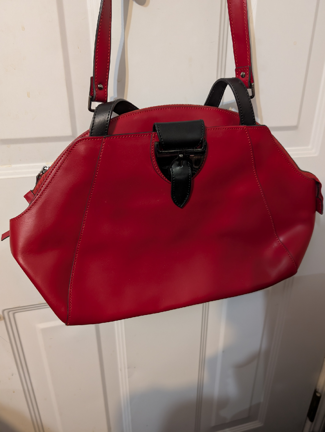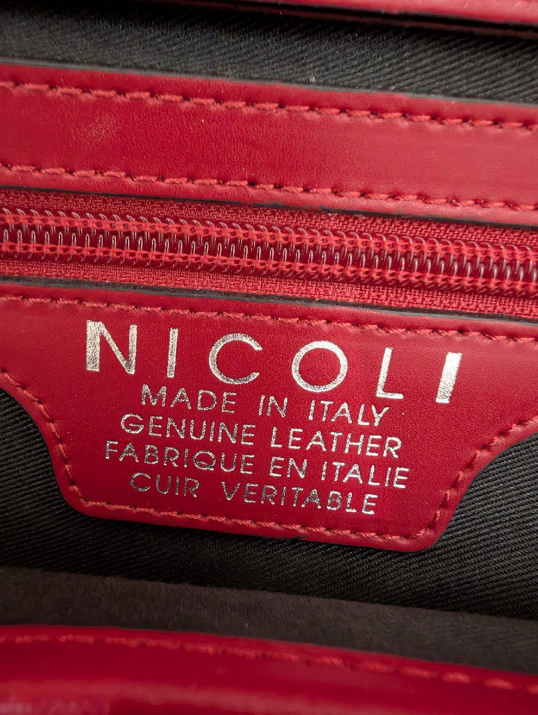 Selling a vibrant red Nicoli handbag, made in Italy with genuine leather. This stylish medium size purse features black accents and a unique design. Perfect for adding a pop of colour to your outfit!