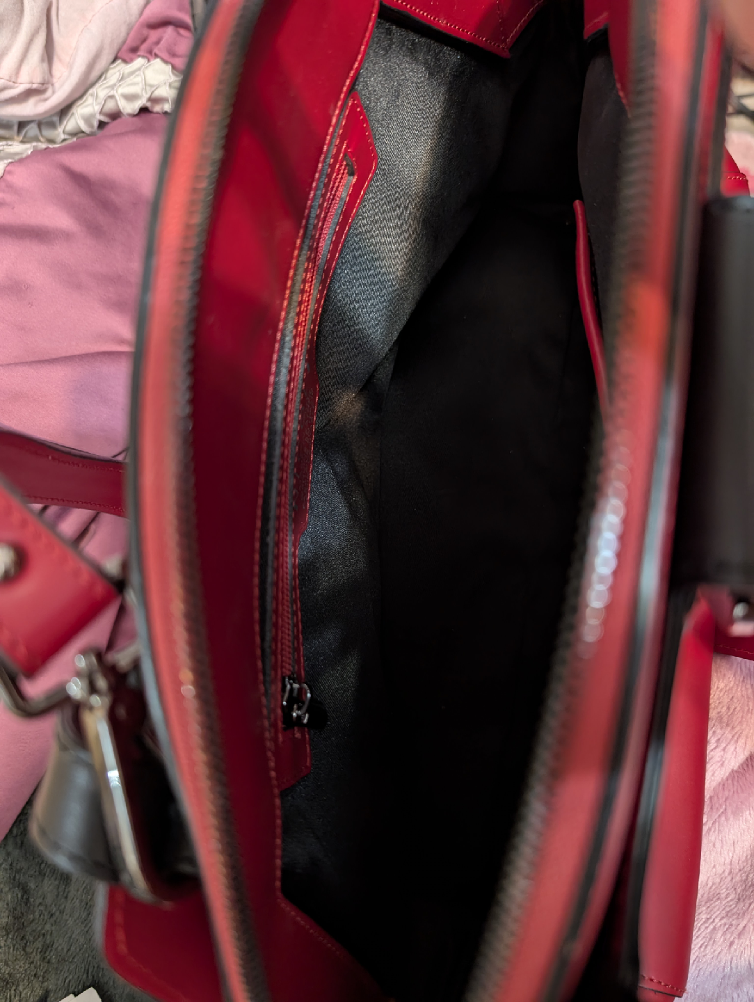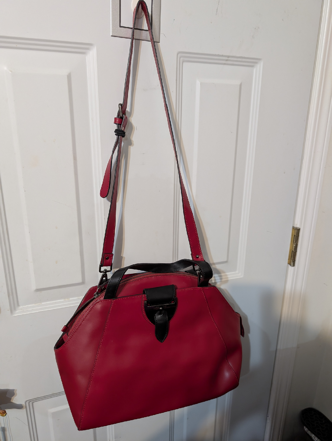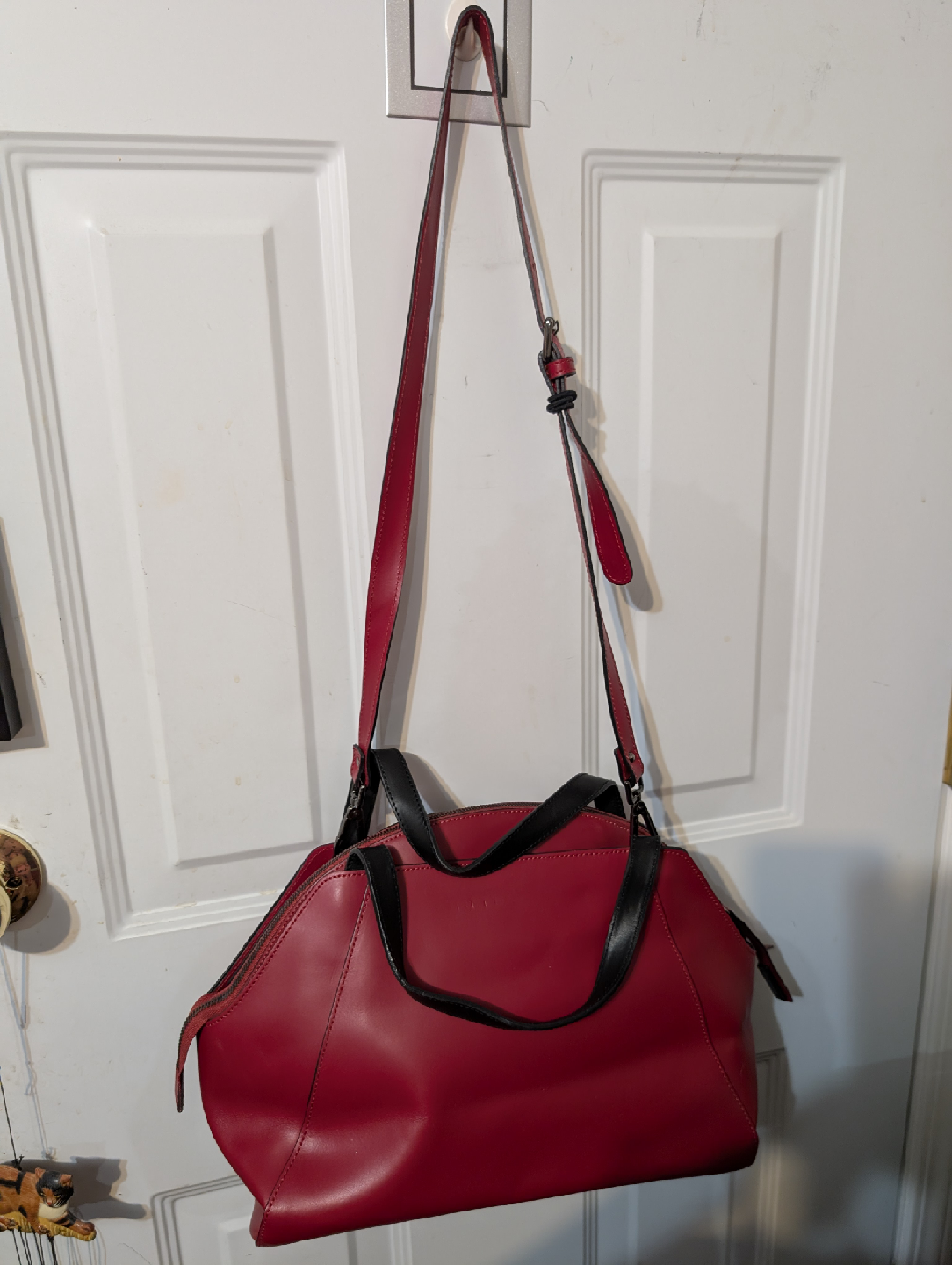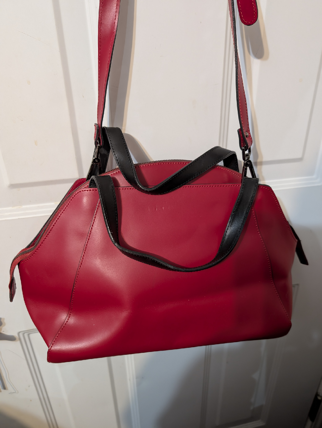 Selling a vibrant red Nicoli handbag, made in Italy with genuine leather. This stylish medium size purse features black accents and a unique design. Perfect for adding a pop of colour to your outfit!