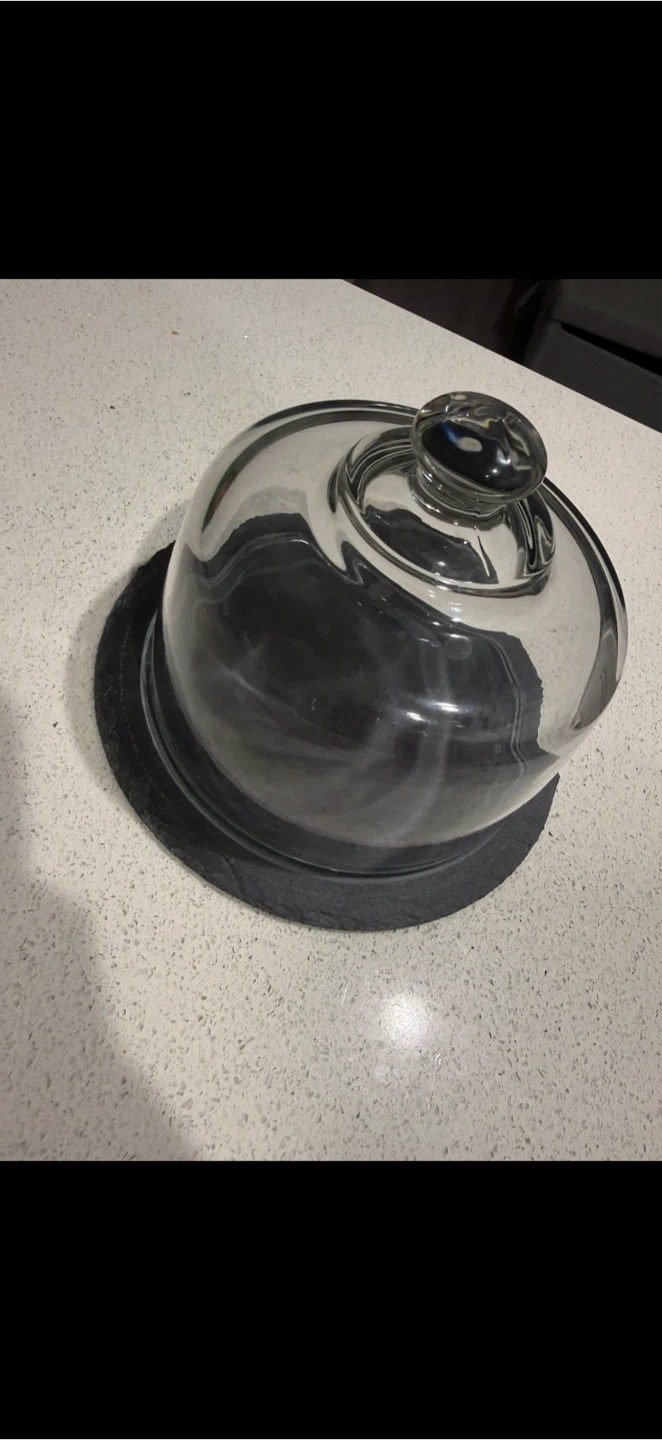 This is a glass dome cloche with a round slate base. It's perfect for serving and protecting cheeses, pastries, or small desserts. The glass dome measures approximately 8 inches in diameter.