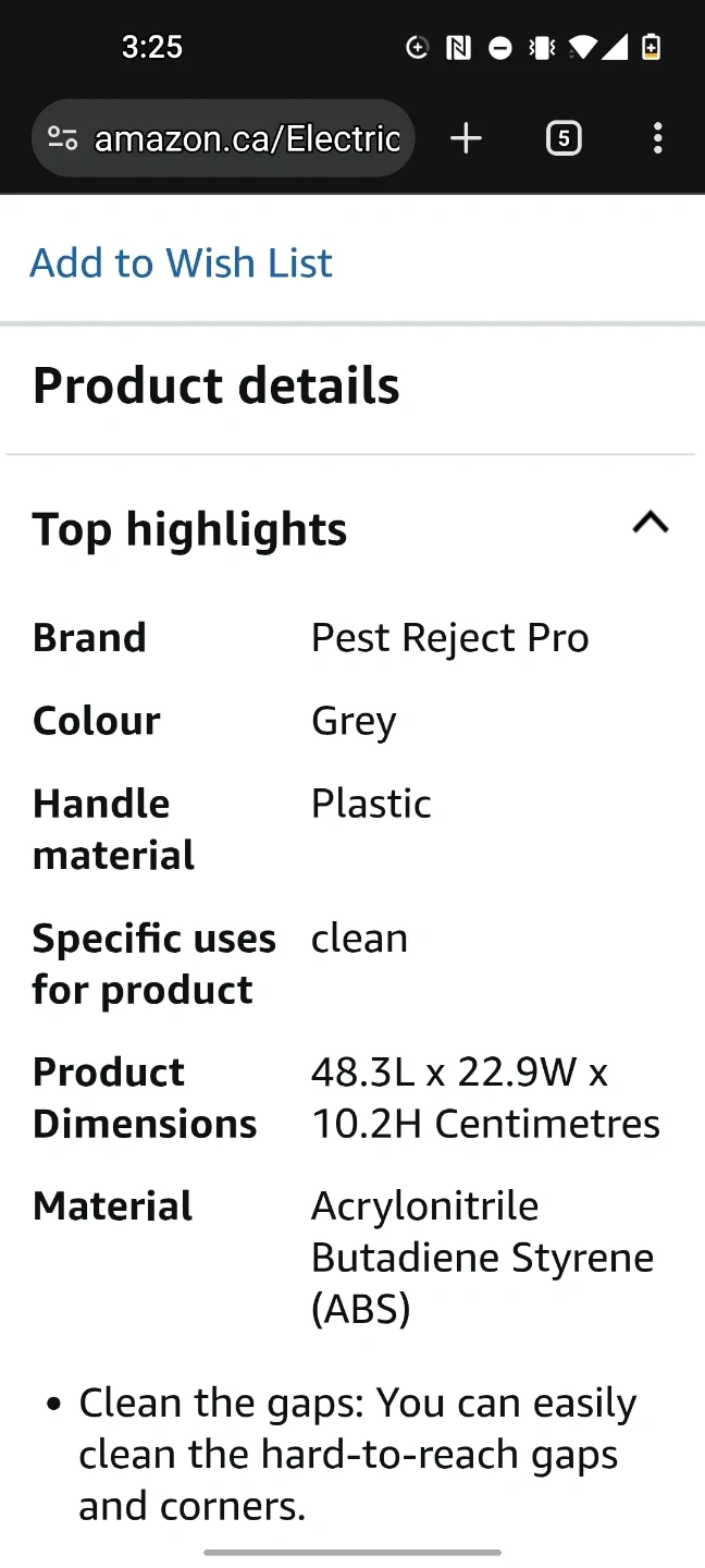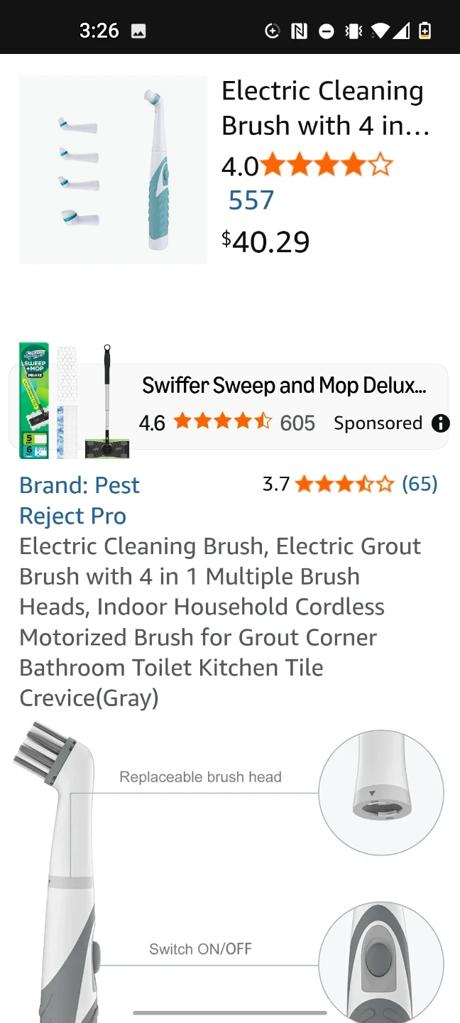 This Pest Reject Pro electric cleaning brush comes in grey and includes four brush heads. It's made from Acrylonitrile Butadiene Styrene (ABS) plastic. This brush is designed to clean gaps, hard-to-reach areas, and corners.