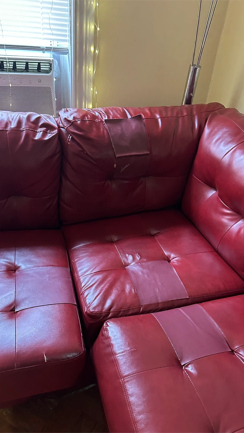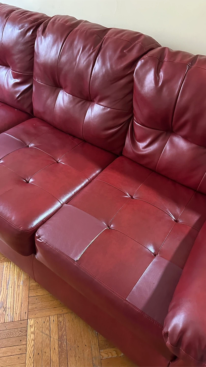 Red faux leather sectional couch. It's a large piece with a chaise lounge. Shows some wear on one of the back cushions. Please pick up if you like it!