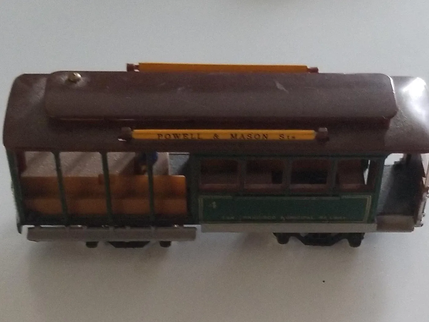 This is a model of a San Francisco cable car. It's marked with 'Powell & Mason Sts.' and 'San Francisco Municipal Railway'. It features detailed seating inside.