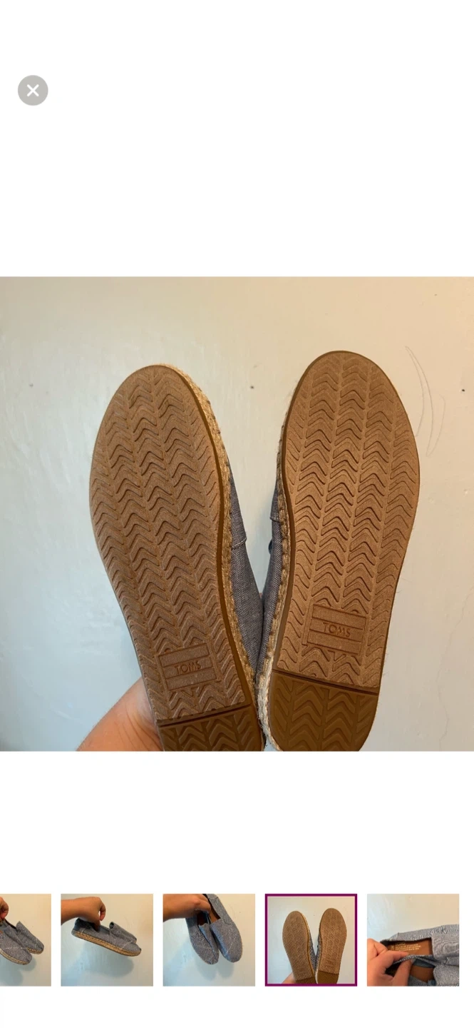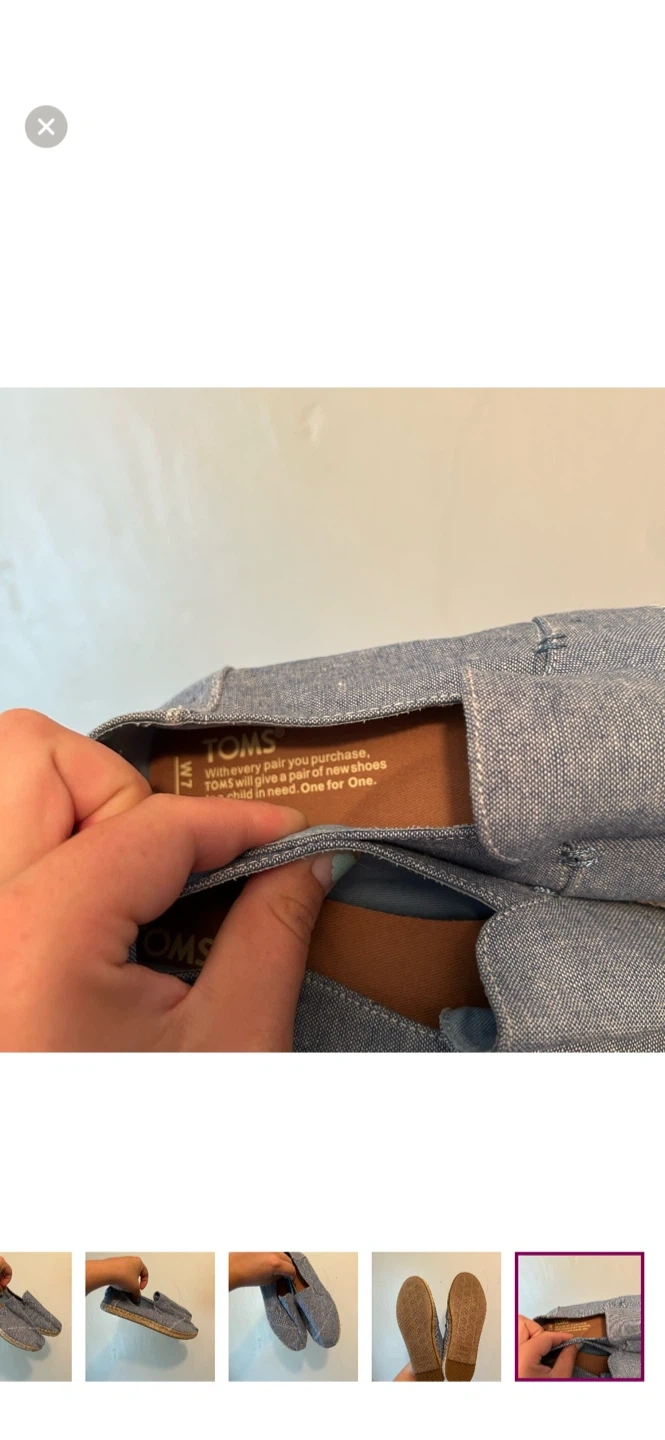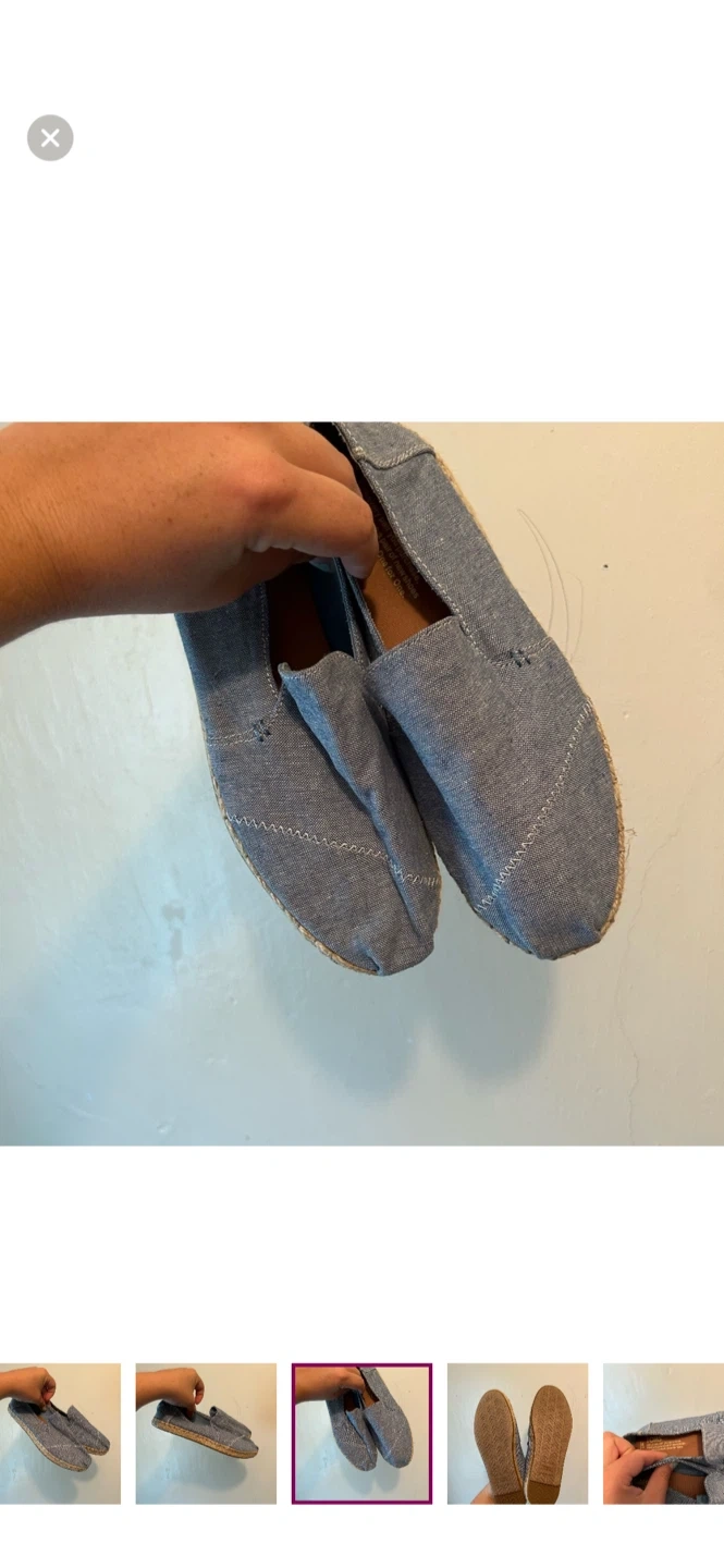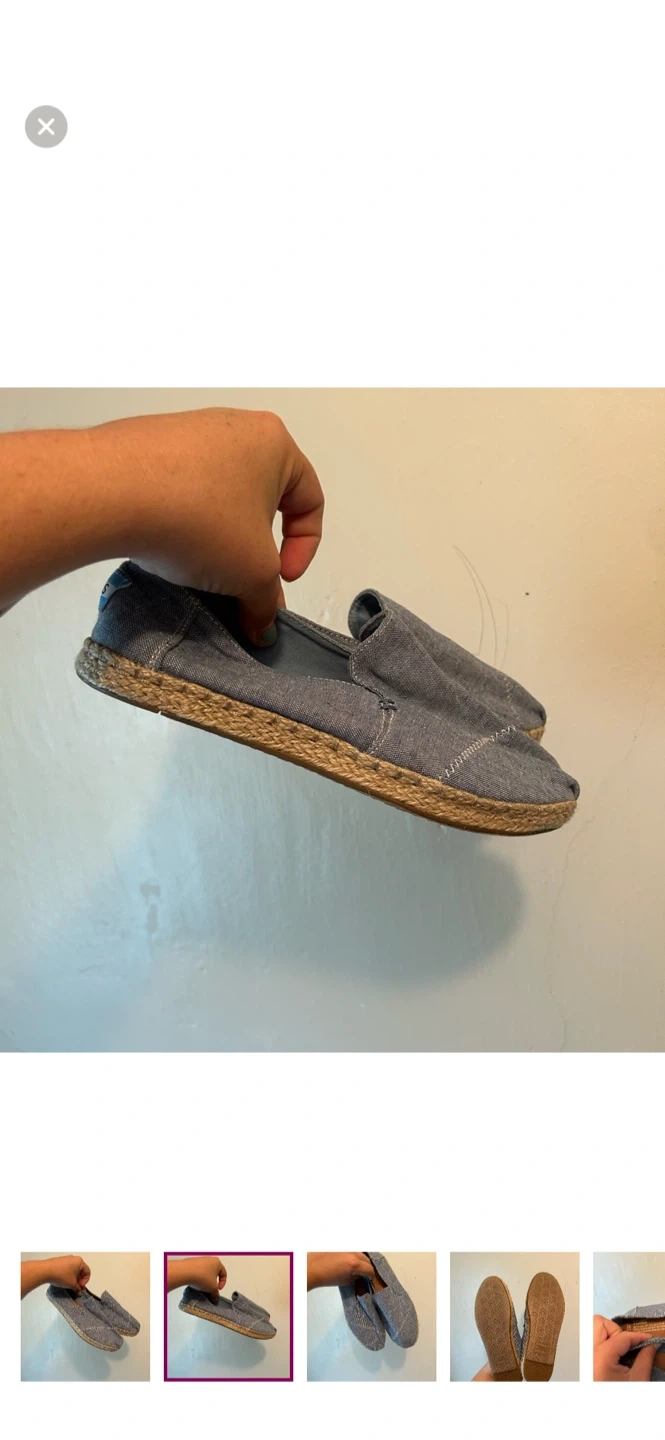 TOMS Brand. Slip on flat shoes. Denim looking blue with woven sole trim. Size women’s 7. Brand new condition