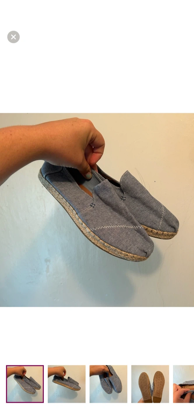 TOMS Brand. Slip on flat shoes. Denim looking blue with woven sole trim. Size women’s 7. Brand new condition
